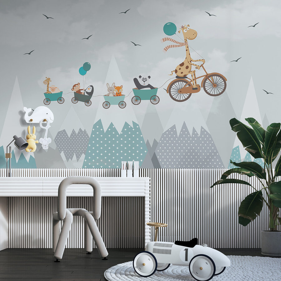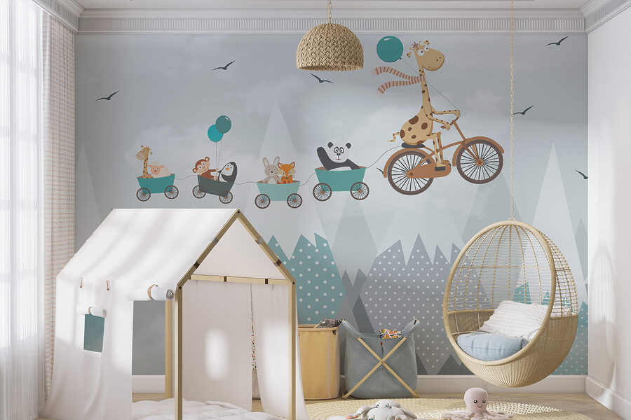 Wil je een beetje eigenzinnigheid toevoegen aan de kamer van je kind? Kijk dan eens naar de “Muurschildering Giraffe op de fiets” – het is net een heerlijke dagdroom die over de muur spat. Deze leuke muurschildering toont een avontuurlijke giraffe die door een dromerig landschap trapt en een stoet schattige dieren meesleept. De zachte pasteltinten en speelse scènes voeren je kleintje mee naar een wereld vol verbeelding en zijn daarom perfect voor kinderkamers of speelzalen. Stel je voor dat verhaaltjes voor het slapengaan veranderen in ongelooflijke reizen met deze achtergrond. En die charmante stippen en bergen? Gewoon te schattig. Deze muurschildering is niet alleen decoratie – het is elke dag een ticket naar avontuur.