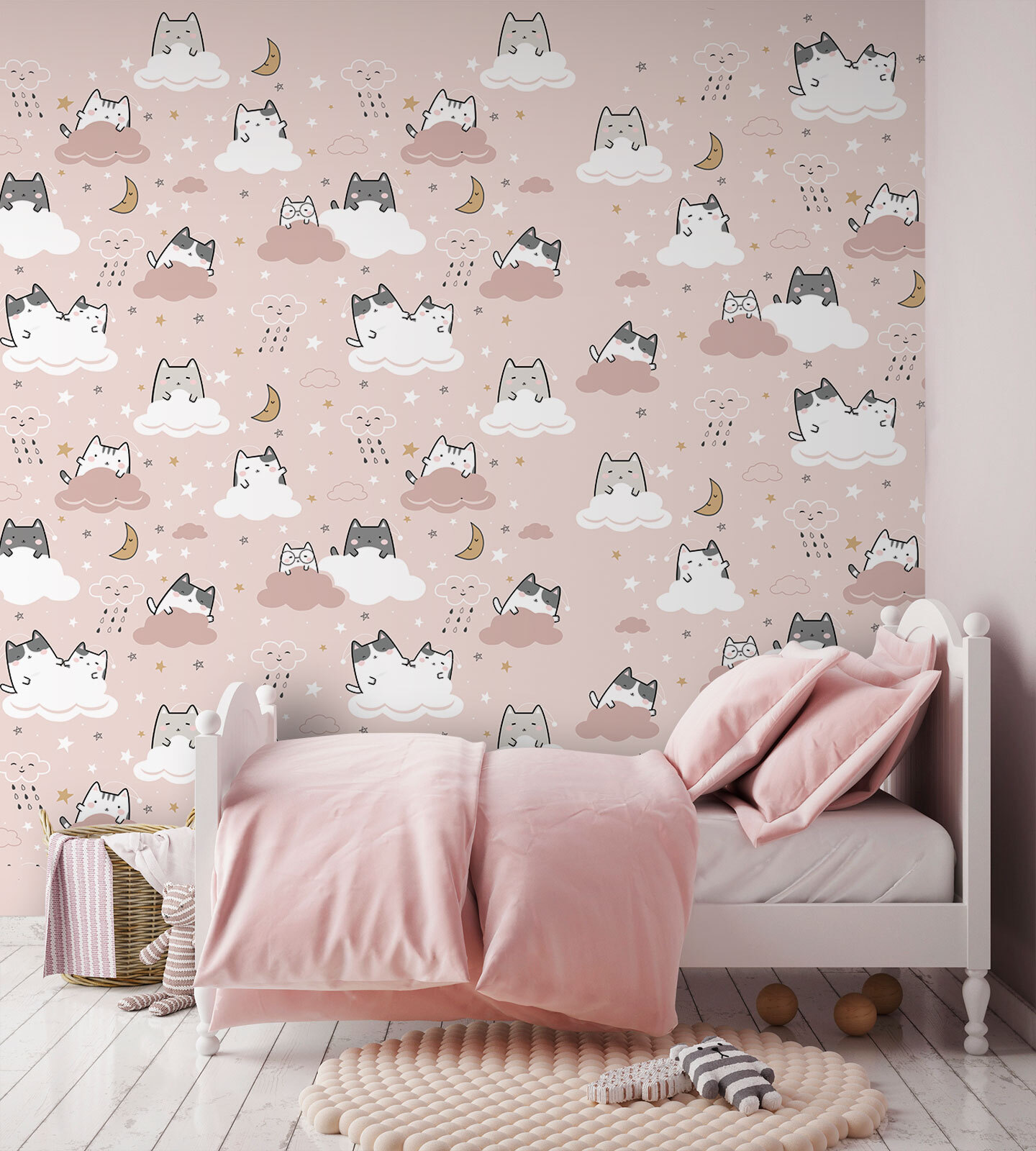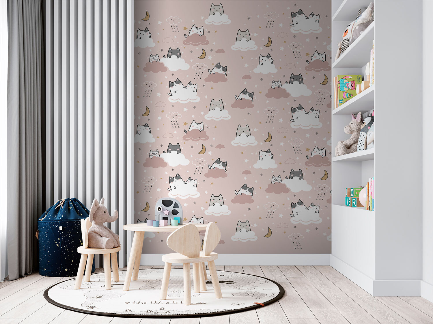 De zachte, pastelkleurige wolken worden omringd door slaperige sterren en kleine manen, waardoor het voelt als een scène die rechtstreeks uit een verhaaltje voor het slapengaan komt. Elk poesje ziet er zo knus uit dat je zou willen dat je bij ze kon komen zitten. Het is meer dan alleen decoratie; het is een vleugje magie dat van elke ruimte een oase van comfort en plezier maakt.