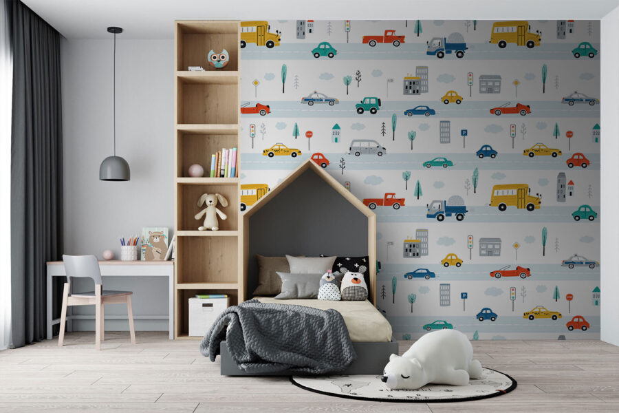 Bekijk deze schattige muurschildering “Patroon van auto’s en gebouwen” – perfect om de kamer van een kind op te fleuren! Stel je een speels stadsbeeld voor met kleurrijke auto’s die over straat rijden en charmante kleine gebouwen die een levendig tintje geven. Het is net alsof je een stukje van je favoriete tekenfilmstad naar je muur brengt.