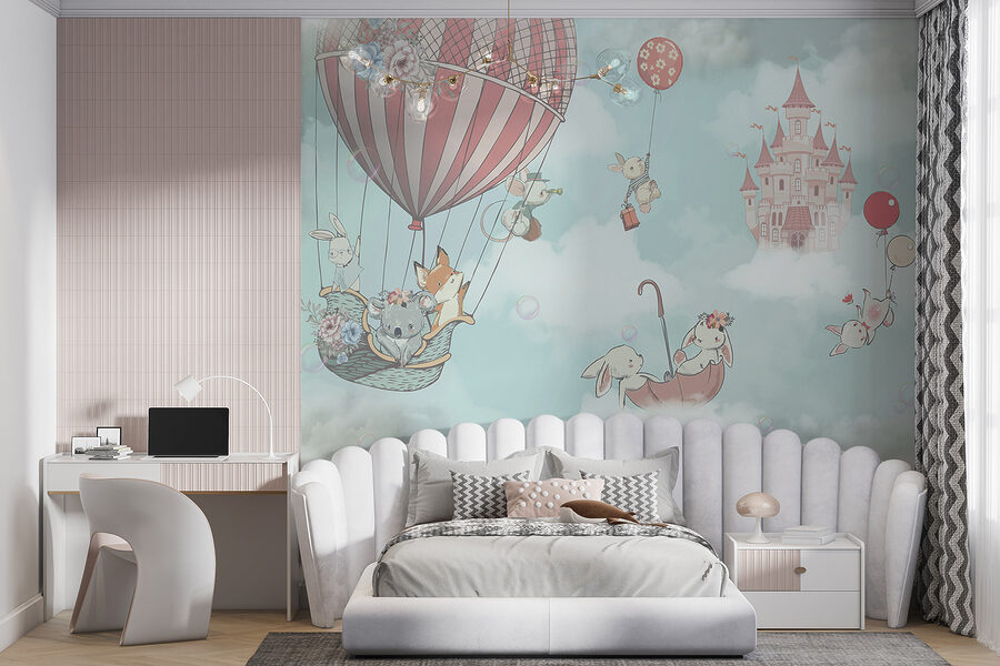 De kleintjes zullen dol zijn op de charmante details – een koala met een bloemenkroon, kleine konijntjes met ballonnen, allemaal zwevend tussen pluizige wolken met een dromerig kasteel op de achtergrond. Het hele tafereel voelt betoverend aan, alsof ze zo in hun eigen sprookje kunnen springen zodra ze wakker worden.