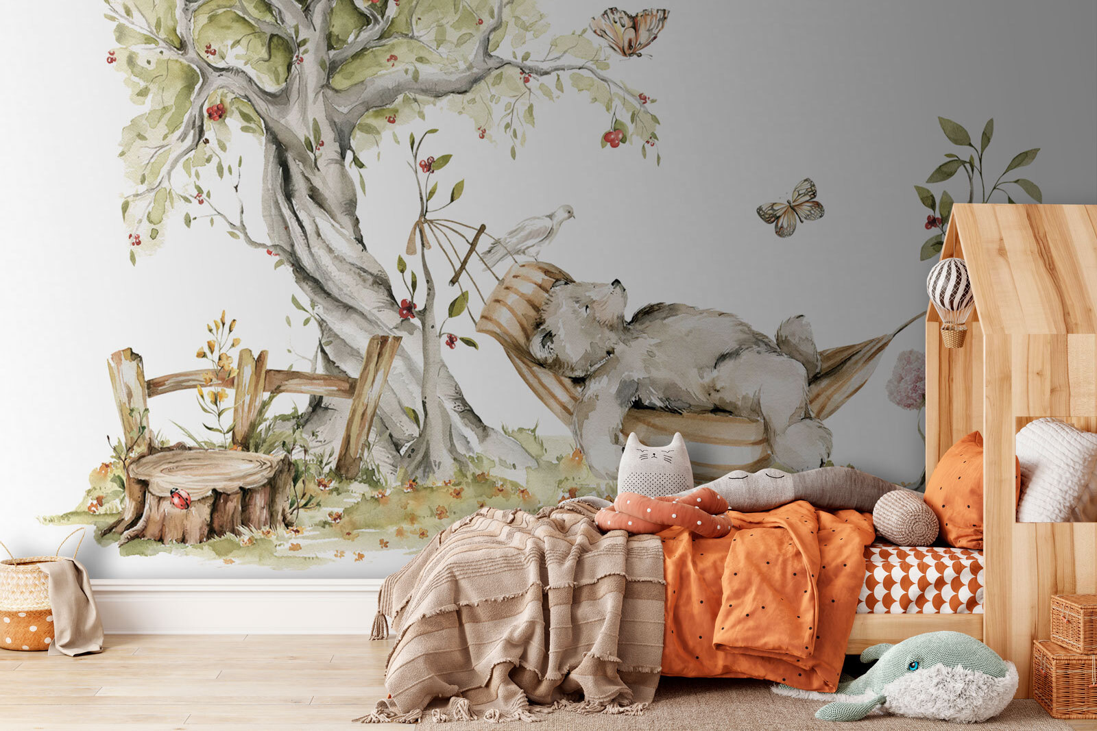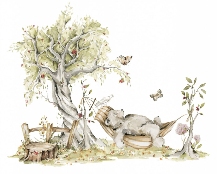 Kinderen zullen er helemaal weg van zijn. Denk je eens in – dit zachte tafereel kan de achtergrond zijn voor verhaaltjes voor het slapengaan of fantasierijk spel. En de zachte, aardse kleuren? Heel rustgevend. Het is alsof je een vleugje natuur in huis haalt zonder de insecten. En wie wil er nu niet dagdromen met die schattige beer in de schaduw?
