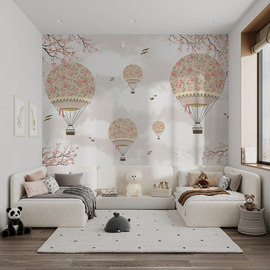 Stel je voor dat je wakker wordt met een hemel vol bloemige luchtballonnen! Deze charmante muurschildering neemt je mee naar een dromerige, grillige wereld waar zwevende bloesems en pluizige wolken elkaar ontmoeten. Deze muurschildering is perfect voor een kinderkamer – vooral voor die van je dochter – en is zacht maar verbeeldingsvol. De bloemenpatronen stralen een vintage sfeer uit en passen moeiteloos in een moderne inrichting. Zie je een kleintje al naar boven staren, avonturen verzinnend? Het is alsof je een stukje magische tuin en het heerlijke opstijgen van een ballonfestival in huis haalt. Heerlijk voor kalmerende verhaaltjes voor het slapengaan of om overdag bij weg te dromen!