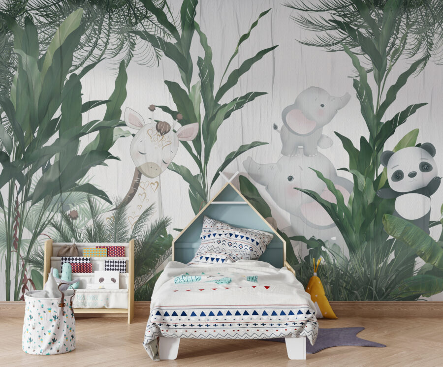 Het installeren van deze muurschildering is alsof je een grillig bos in huis haalt. De jungle vibe trekt je naar binnen en betovert zowel kinderen als volwassenen met zijn speelse charme. Stel je verhaaltjes voor het slapengaan voor met deze betoverende achtergrond – een jungle-expeditie zonder de kamer te verlaten! Het is een vriendelijke mix van levendige groene tinten en schattige, vredige dieren die elke ruimte een knus en avontuurlijk gevoel geven. Kinderen kunnen eindeloze verhalen verzinnen met hun nieuwe bosvriendjes. Het is gewoonweg magisch.