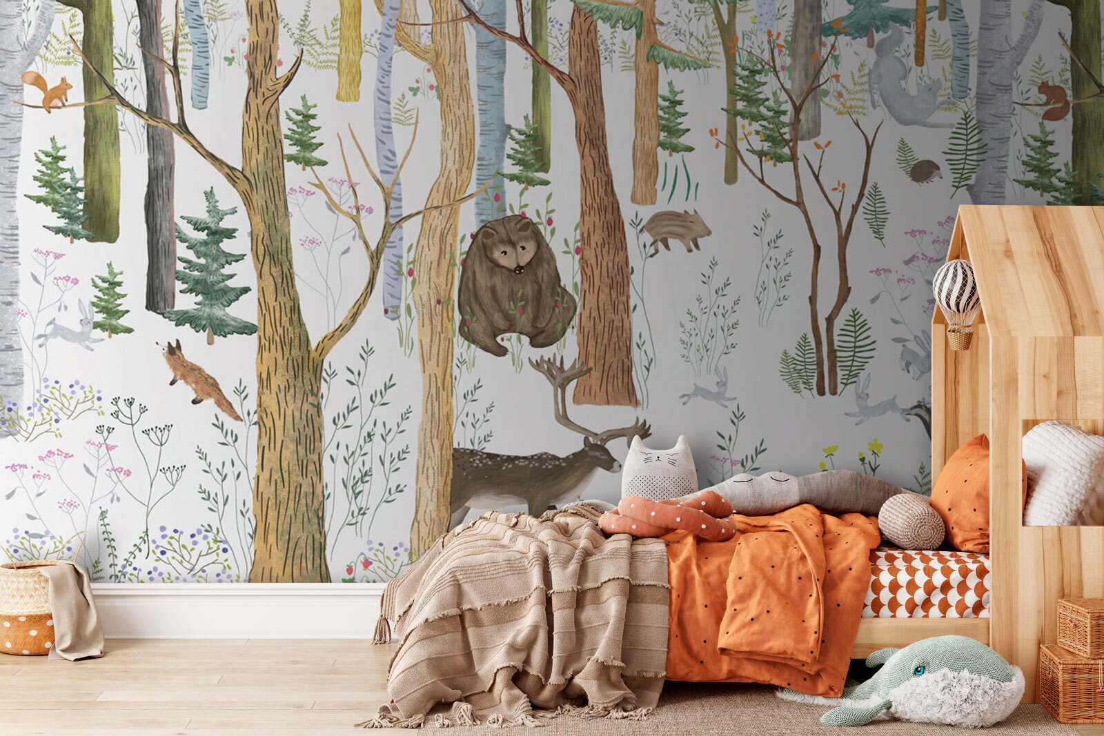 Deze muurschildering past perfect in kinderkamers, kinderspeelkamers of waar je maar een vleugje verwondering en vrolijkheid wilt toevoegen. Het is charmant genoeg voor baby’s, maar ook fascinerend voor opgroeiende kinderen. Telkens als je binnenkomt, is het alsof je een sprookje binnenstapt. Stel je voor dat verhaaltjes voor het slapengaan een nieuwe diepte krijgen, waarbij je kind een hert aanwijst of een ondeugende eekhoorn die ze eerder hebben “ontmoet”. Een muur die met hen meegroeit? Onbetaalbaar!