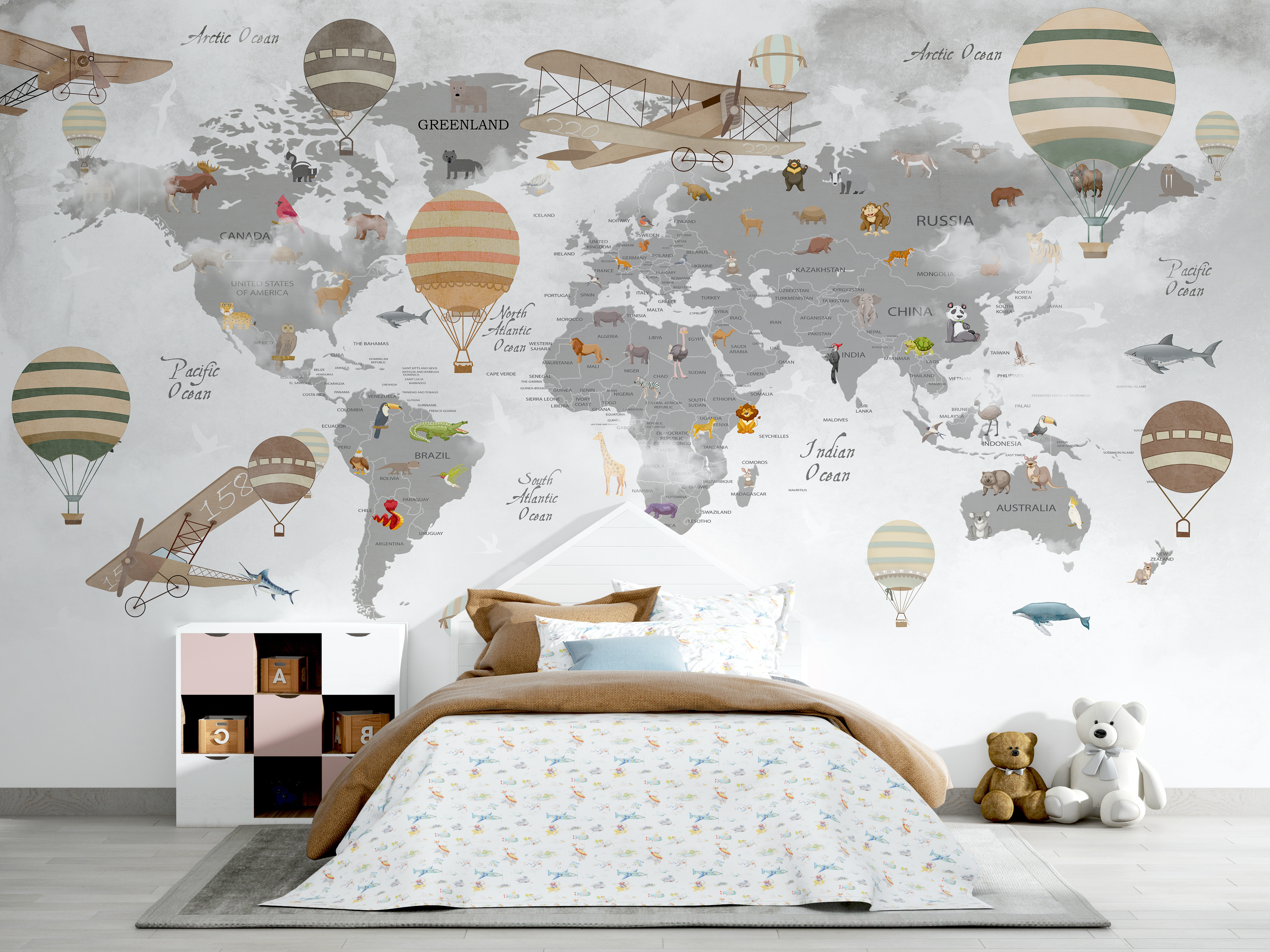 Stel je voor – je kleine avonturier wordt wakker met een kamer vol grillige heteluchtballonnen die over een ouderwetse kaart zweven! “Hete luchtballon met een haai op de achtergrond” is een eigenzinnige, betoverende muurschildering die perfect is om nieuwsgierigheid op te wekken. Het gaat niet alleen over aardrijkskunde; het is als een verhaal dat zich nog moet ontvouwen. Stel je voor dat je voor het slapengaan verhaaltjes vertelt over reizen over de wereld, het ontmoeten van dieren en het stiekem gluren naar die brutale haai. Ideaal voor kinderen die groot dromen, het verandert elke ruimte in een speels lanceerplatform voor verbeelding. Het is leuk, leerzaam en een vleugje vintage charme, allemaal samengebracht in een fantastische muurdecoratie!