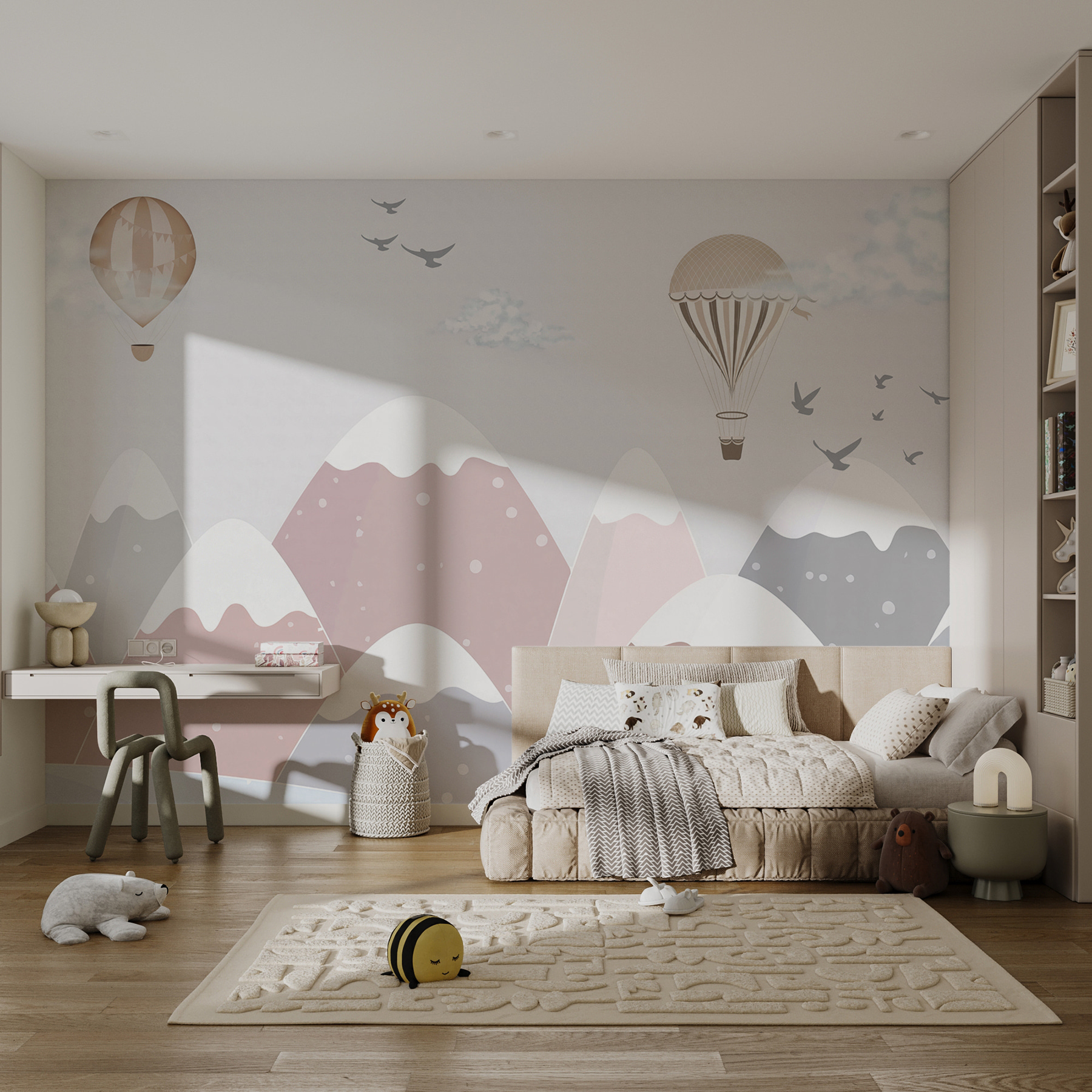 Stel je eens voor: een gezellige kamer waar ballonnen hoog boven besneeuwde bergen zweven. Deze prachtige muurschildering “Balloons Soar Above Snowy Mountains” is perfect voor een kinderkamer. Het zijn zachte, rustgevende kleuren die rechtstreeks uit een droom lijken te komen. Zie het voor je in de kamer van je dochter of zelfs in de kinderkamer: ballonnen die zachtjes door de lucht zweven en de verbeelding en verwondering prikkelen.