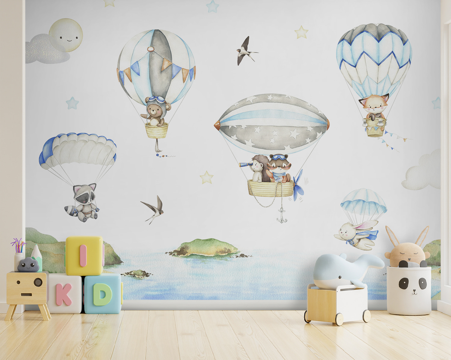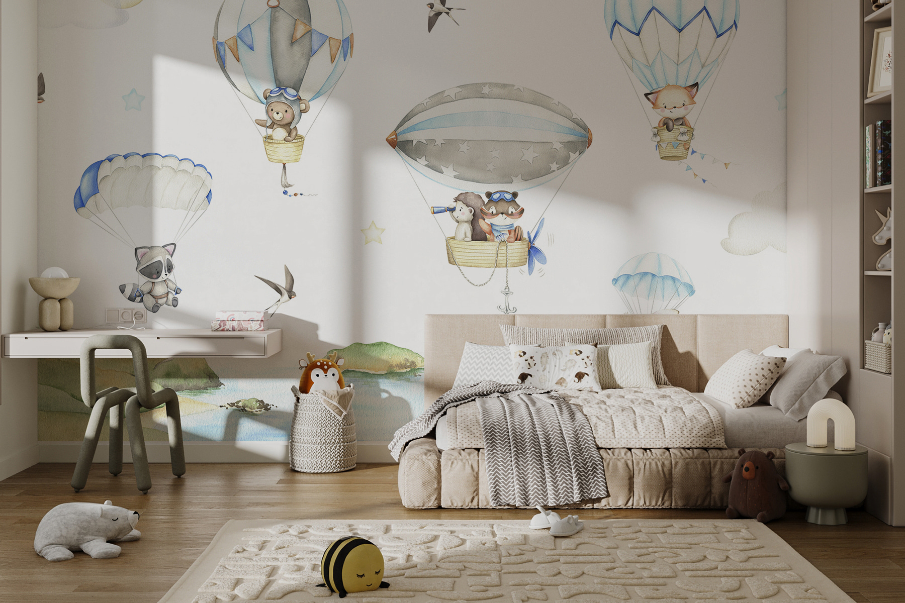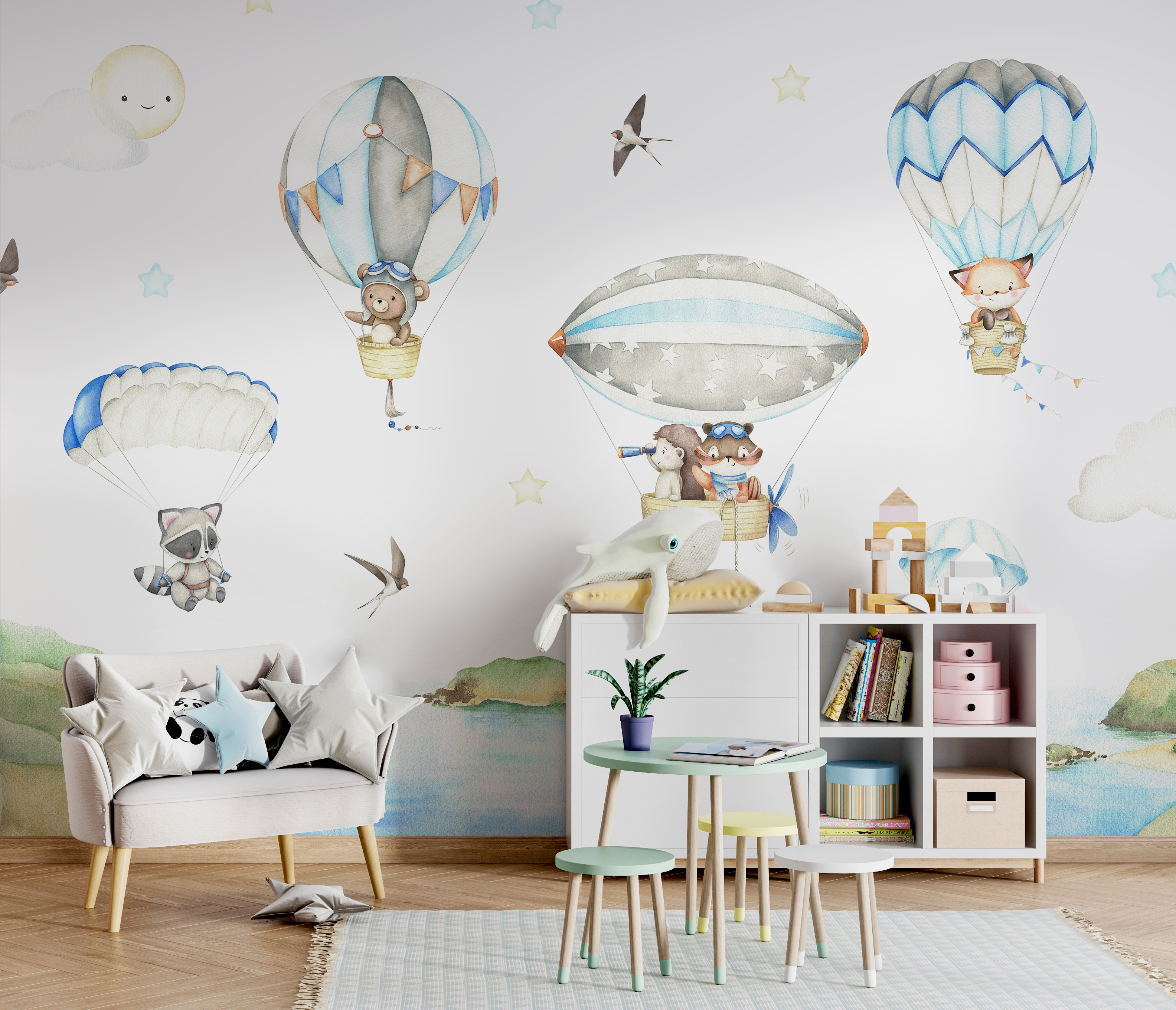 Waarom genoegen nemen met effen muren als je je kleintje mee op avontuur kunt nemen met deze schattige muurschildering? “Teddybeer in een luchtballon” is gewoon te schattig om te weerstaan. Stel je een lieve teddybeer voor, uitgedost met een vliegeniersbril, die zachtjes door de lucht zweeft. De charme van dit dromerige tafereel is perfect om eindeloze verhalen te vertellen en nachtelijke dromen te kalmeren. Perfect voor kinderkamers, het voegt een speels tintje toe dat veilig en zacht is voor de ogen. Echt, wie zou hier niet elke ochtend wakker van willen worden? Het voelt alsof je in een prentenboek bent beland waar elke dag een nieuw avontuur in de lucht is. De zachte pasteltinten en grillige personages zorgen ervoor dat het niet alleen een blikvanger is, maar ook een sfeermaker. De kamer van je kind verandert meteen in een gezellige, magische plek waar luchtballonnen en dromen tot leven komen.