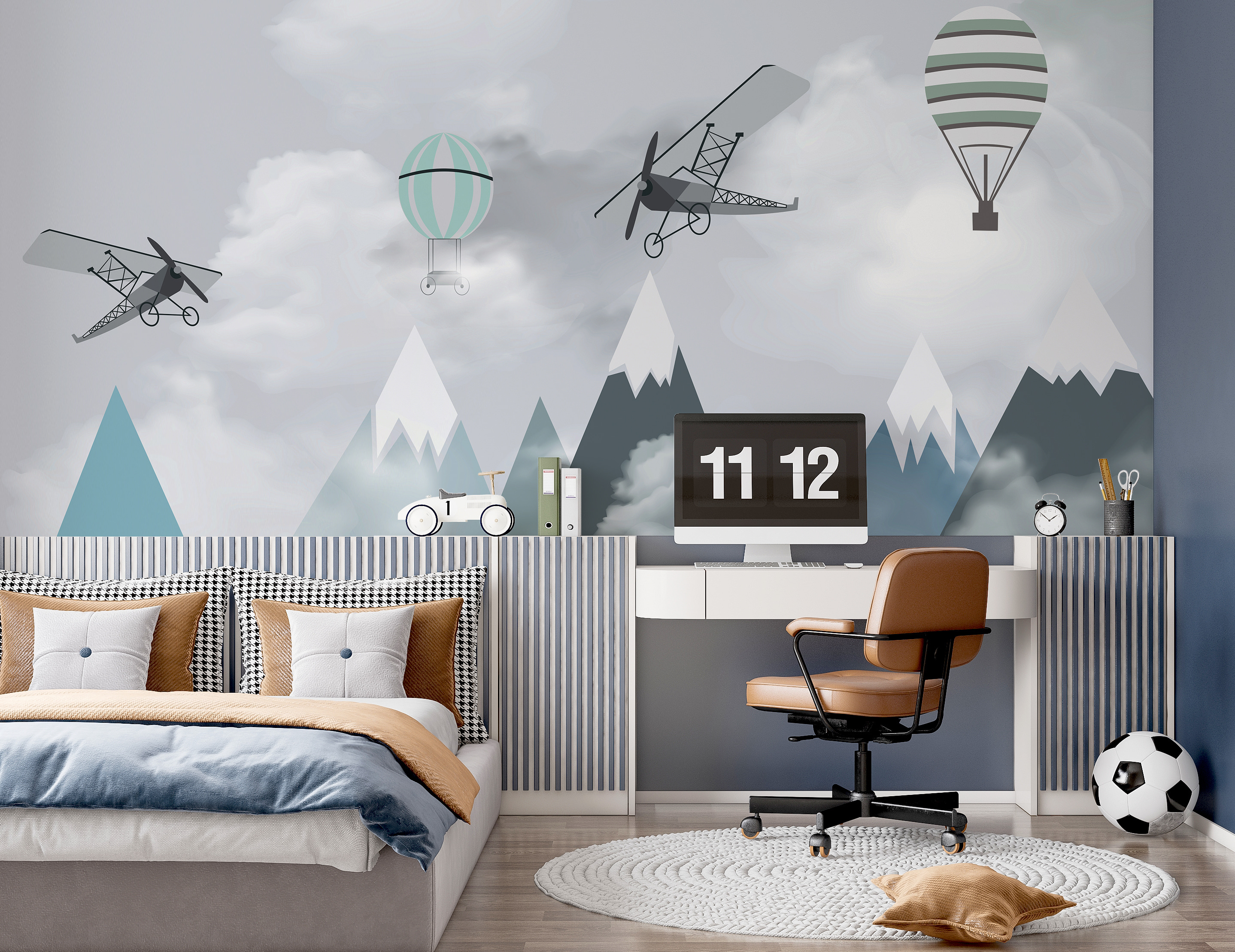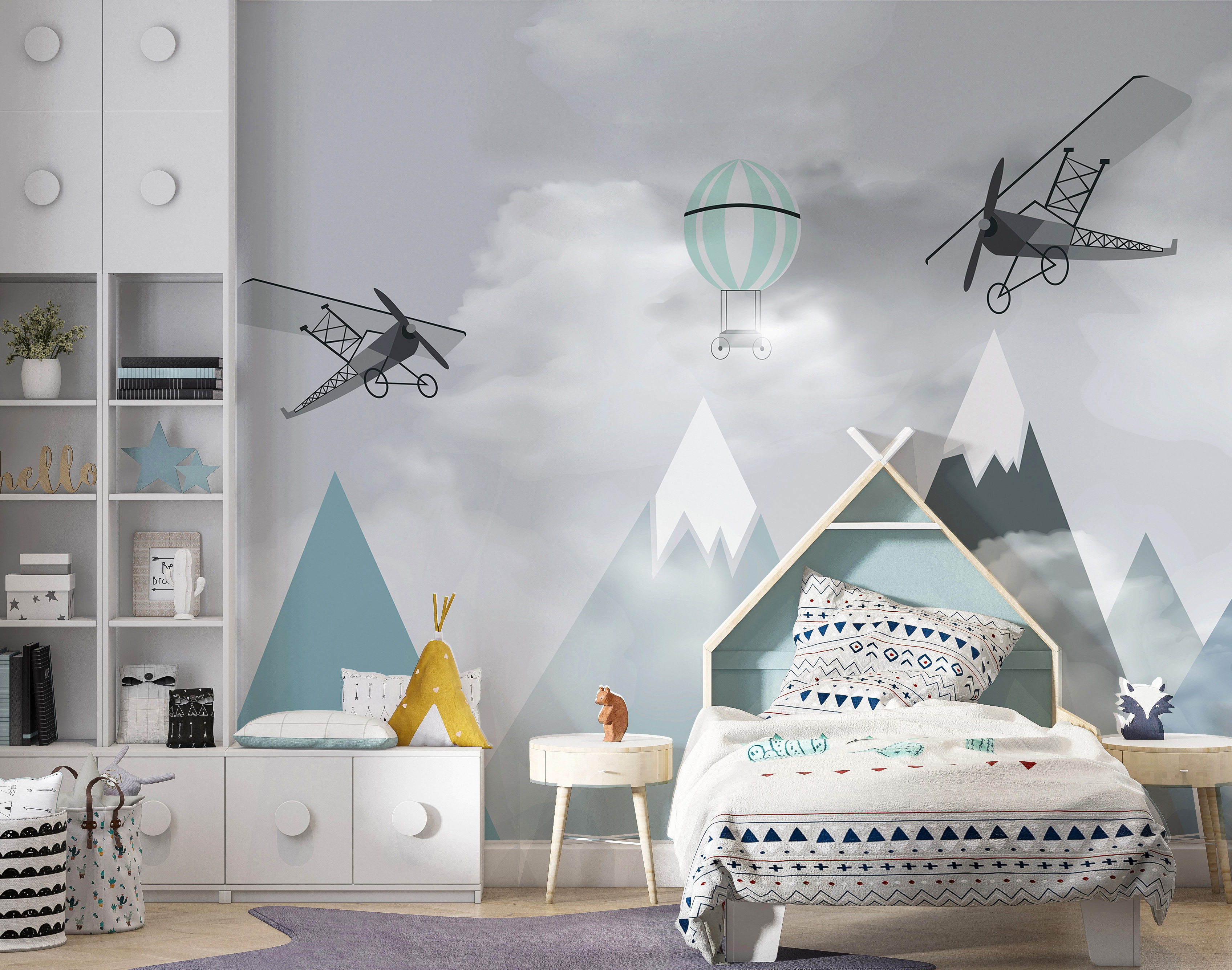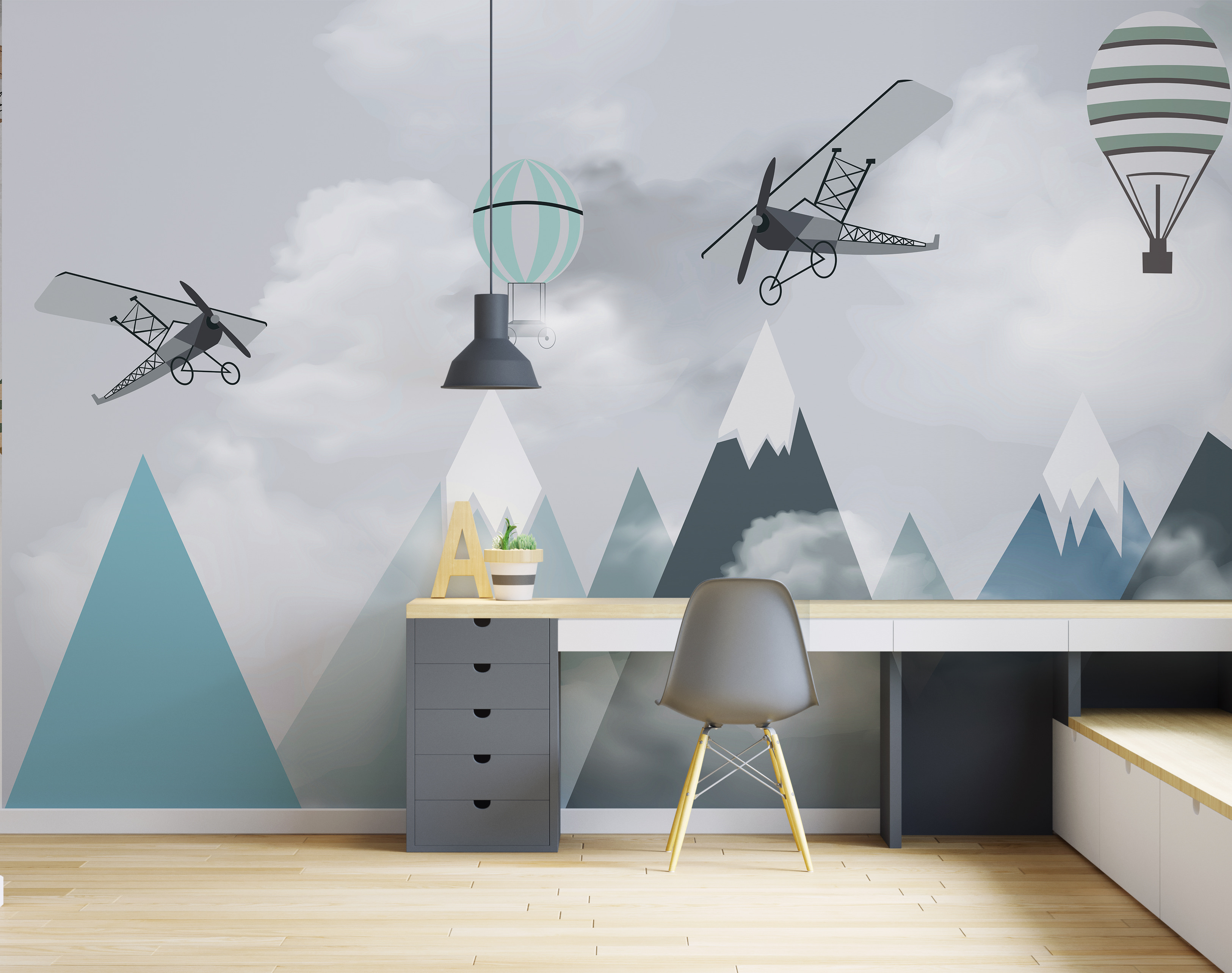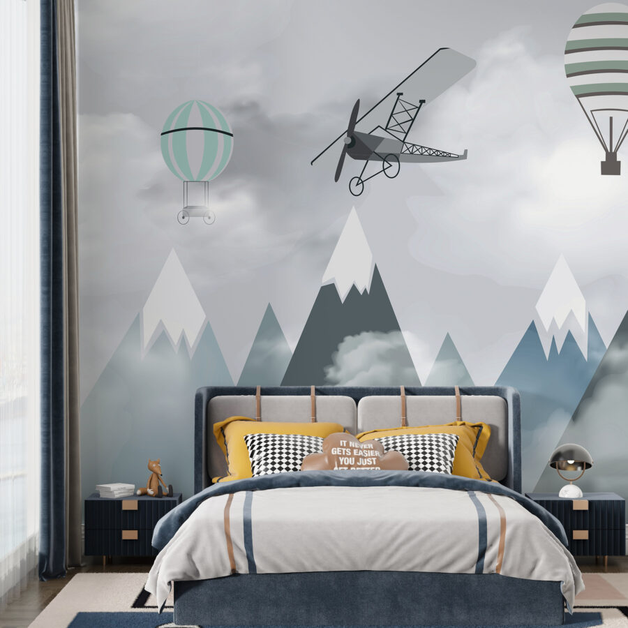 Stel je voor dat de kamer van je kind verandert in een dromerig avontuur op grote hoogte met deze prachtige “Muurschildering Vliegtuigen en ballonnen over bergen”. Het is alsof je in een sprookjesboek stapt waar grillige vliegtuigen en heteluchtballonnen lui over serene bergtoppen zweven. Deze muurschildering is perfect voor je kleine vliegenier of aspirant-verkenner en wekt een gevoel van verwondering en eindeloze mogelijkheden op.