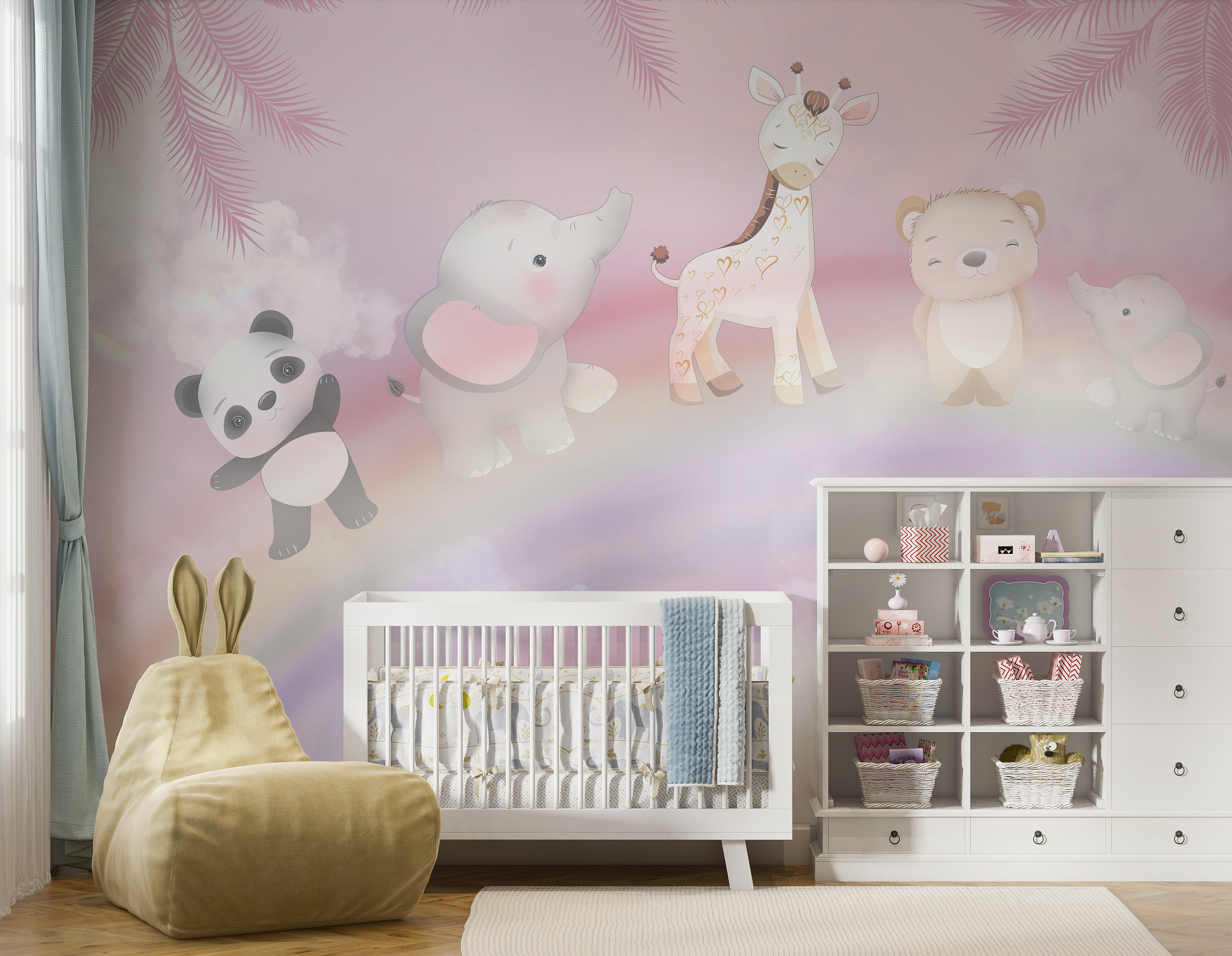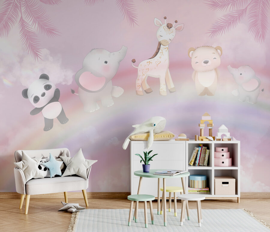 Stel je voor dat je de kamer van je kleintje binnenloopt en begroet wordt door deze charmante groep – een schattige panda, een zachte giraffe, een gezellige beer en hun speelse vrienden. Deze “Fotobehang Cartoon of a Panda” is meer dan gewoon decor; het is alsof je in een grillige dagdroom stapt. Zachtroze luchten en pluizige wolken creëren een rustgevende achtergrond terwijl een pastelkleurige regenboog alles samenbindt – het voelt als een knuffel, nietwaar? De muurschildering is ideaal voor kinderkamers en zorgt voor een beetje vreugde en verwondering, waardoor fantasierijke avonturen elke dag weer worden aangewakkerd. Perfect om de creativiteit van je kind te stimuleren en hun ruimte in een magisch toevluchtsoord te veranderen. Prachtig, toch?