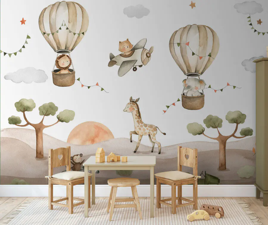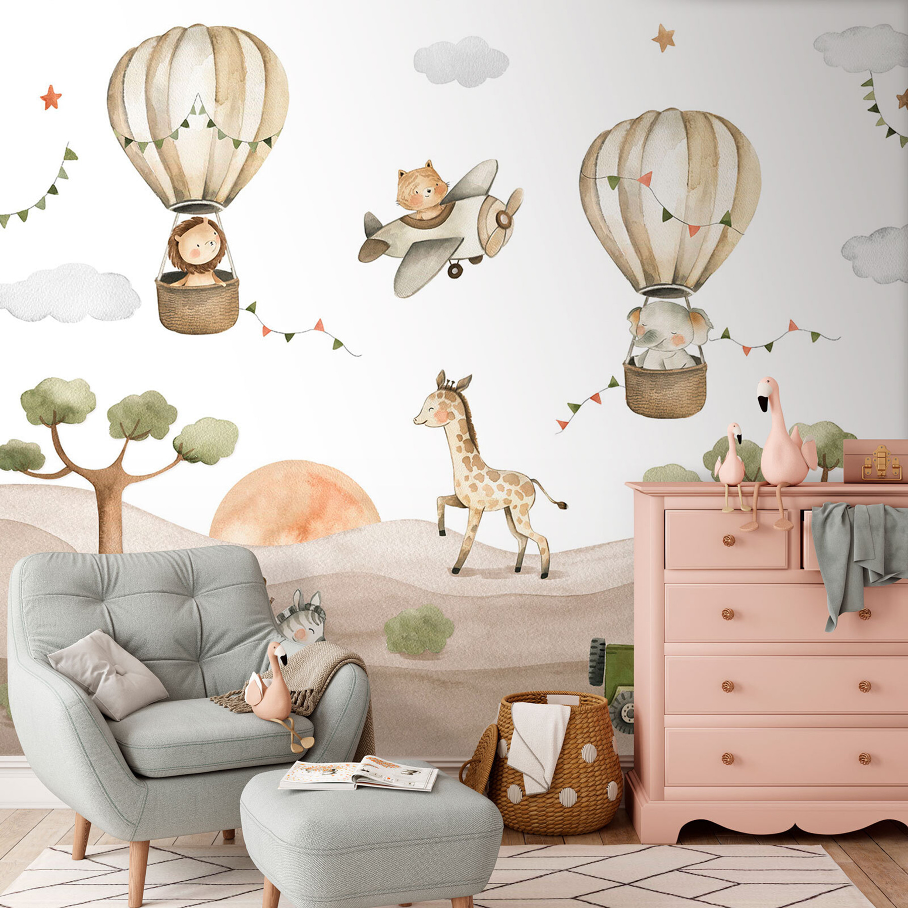 Kijk hier eens naar – een muurschildering met de naam “Aap rijdt op een zebra”! Perfect voor de kamer van je kleine ontdekkingsreiziger, of ze nu van dieren houden of gewoon een wilde verbeelding hebben. Stel je voor: een aap rijdt vrolijk op een zebra door een grillig landschap dat eruitziet als iets uit een verhaaltje voor het slapengaan. Luchtballonnen, een speelse giraffe en een vriendelijke jeep maken dit schattige tafereel compleet. Stel je voor dat je kind hier elke ochtend wakker van wordt, met het gevoel dat hij of zij op een eindeloos avontuur is. Het is niet zomaar kunst aan de muur, het is een vonk voor verhalen vertellen en dagdromen. Hoe cool is dat? Deze muurschildering is een hit voor elke kinderkamer en maakt hun ruimte leuk en uniek. Wie wist dat decoreren zo leuk kon zijn?