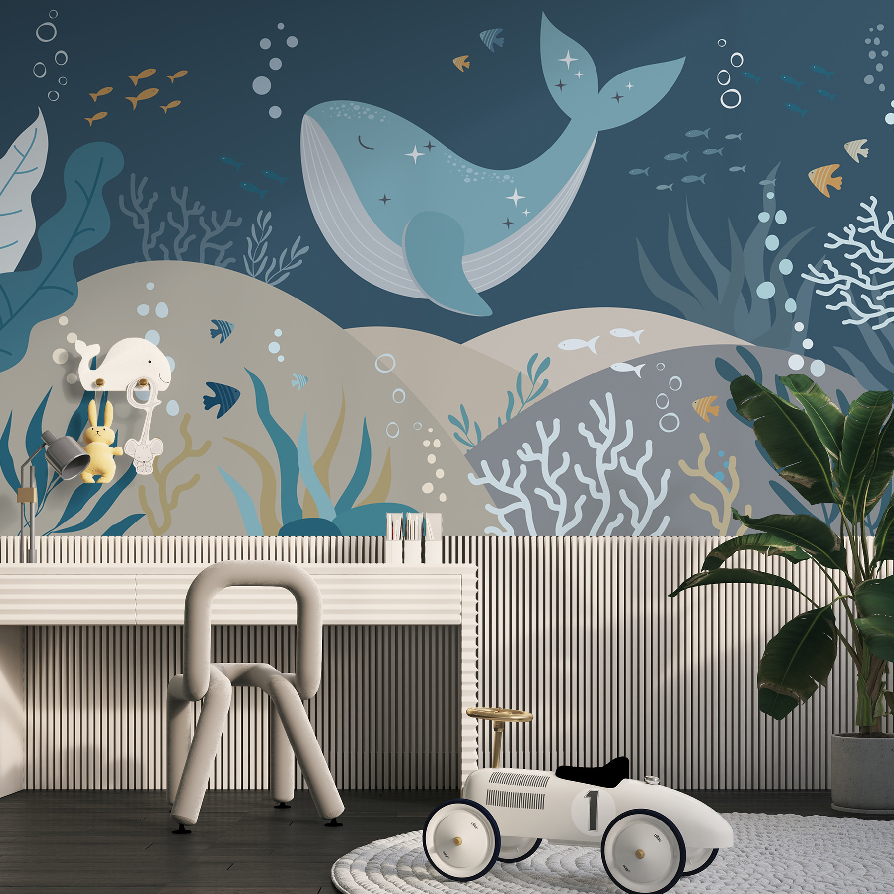 Bekijk deze grillige muurschildering “Blauwe walvis met sterren en vissen”. Serieus, het is alsof je in een onderwater dromenland duikt! Stel je een zachtjes drijvende blauwe walvis voor, besprenkeld met fonkelende sterren, omringd door speelse vissen, perfect voor een kinderkamer of kinderkamer. Wees niet verbaasd als de kleintjes verdwalen in hun eigen oceaanavonturen. De zachte blauwe tinten zijn als een kalme knuffel – ah, zo rustgevend. Maak elke avond voor het slapengaan een magische zeereis met deze betoverende muurschildering. Het is alsof je een stukje oceaan in huis haalt!