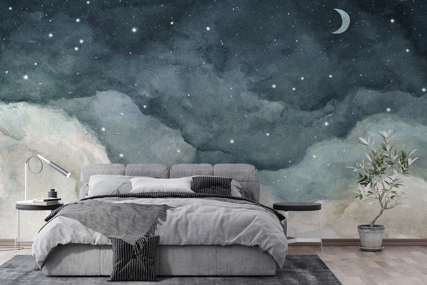 Hier is een muurschildering die je op Cloud 9 laat zweven – letterlijk! De muurschildering “Wolken en sterren in de lucht” brengt een dromerige sterrennacht in je kamer. Perfect voor kinderkamers of iedereen die een slaapkamer wil veranderen in een nachtelijk wonderland. Stel je voor dat je in bed ligt en omhoog staart naar zachte wolken en fonkelende sterren – het voelt alsof je door de nachtelijke hemel vliegt.