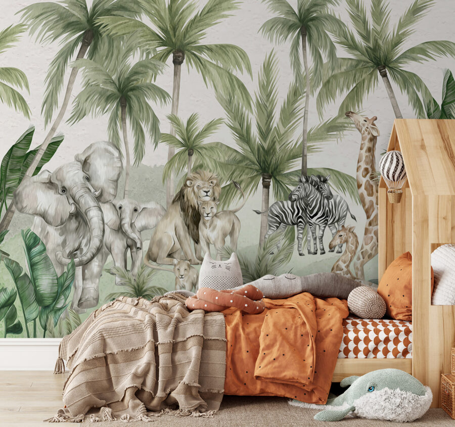 Tover de kamer van je kind om in een magisch jungleavontuur met de “Muurschildering Jungle dieren onder de palmbomen”. Het is alsof je in een sprookjesboek stapt, met vriendelijke olifanten, speelse zebra’s en majestueuze leeuwen onder wuivende palmbomen. Deze muurschildering is perfect voor baby’s, zonen of dochters en geeft elke kinderkamer of speelkamer een rustige maar spannende uitstraling. Stel je voor welke verhaaltjes je voor het slapengaan met deze achtergrond kunt verzinnen! Kinderen vinden het prachtig om de hoge giraffen te zien die over het weelderige groen gluren. Het is charmant, boeiend en heerlijk wild – een onmiddellijke favoriet voor kleine ontdekkingsreizigers.
