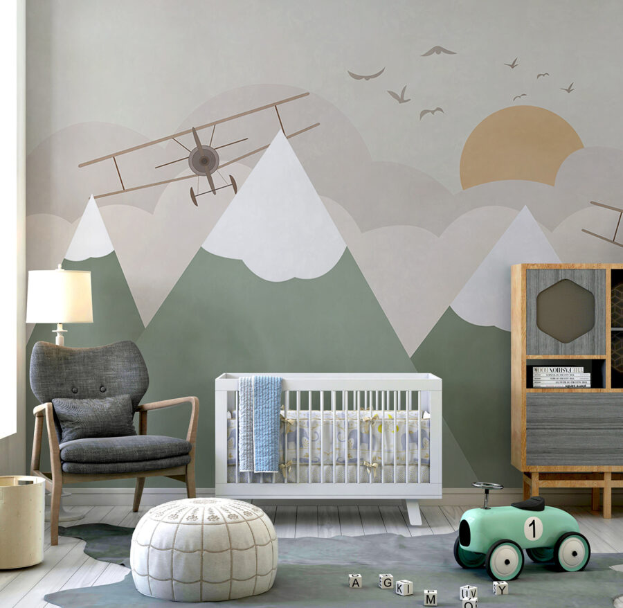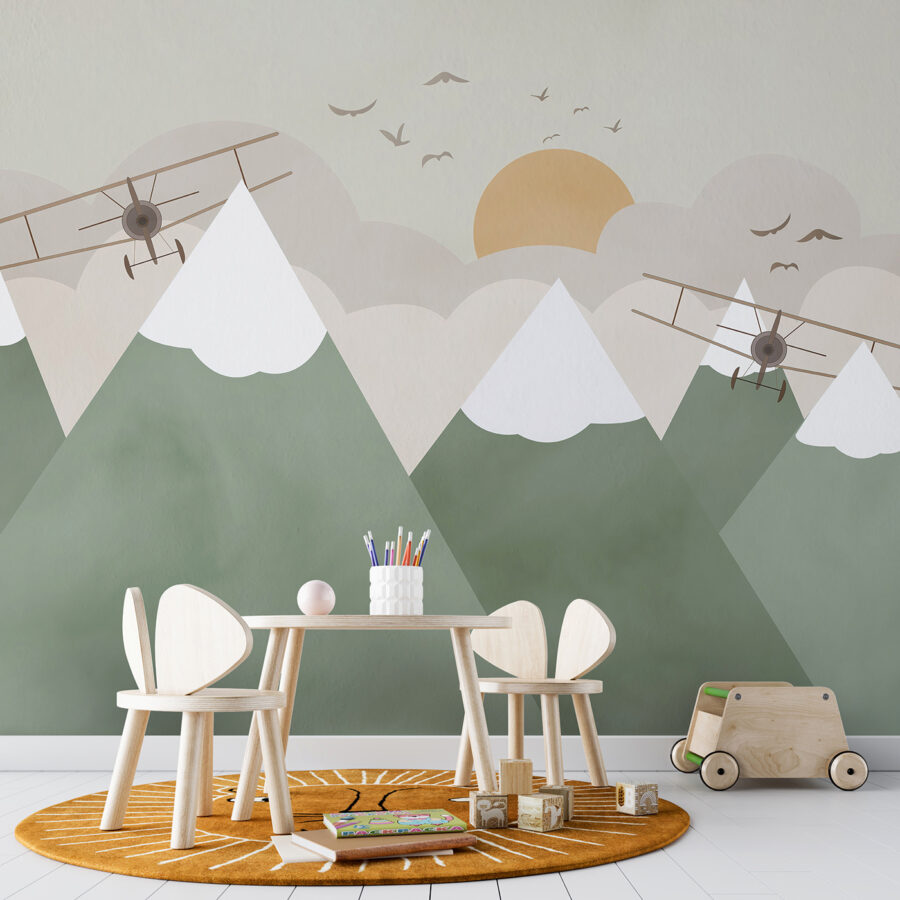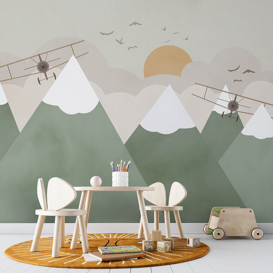 Tover elke kamer om in een grillig avontuur met deze charmante muurschildering van tweedekkers die over besneeuwde bergtoppen zweven. Stel je voor: een knus hoekje waar kleintjes groots kunnen dromen, vliegend door de wolken en bergen veroverend vanuit hun slaapkamer. Door de zachte kleuren en zachte lijnen voelt het als een warme knuffel, die uitnodigt tot verbeelding en tegelijkertijd een serene sfeer creëert. Het is perfect om een gevoel van verwondering op te wekken tijdens verhaaltjes vertellen of spelen. Wie weet inspireert het zelfs toekomstige piloten! Stel je de verhalen voor die zich hier kunnen ontvouwen. Perfect voor een kinderkamer of een leuke speelkamer, deze muurschildering brengt een vleugje magie dat zowel avontuurlijk als gezellig aanvoelt.