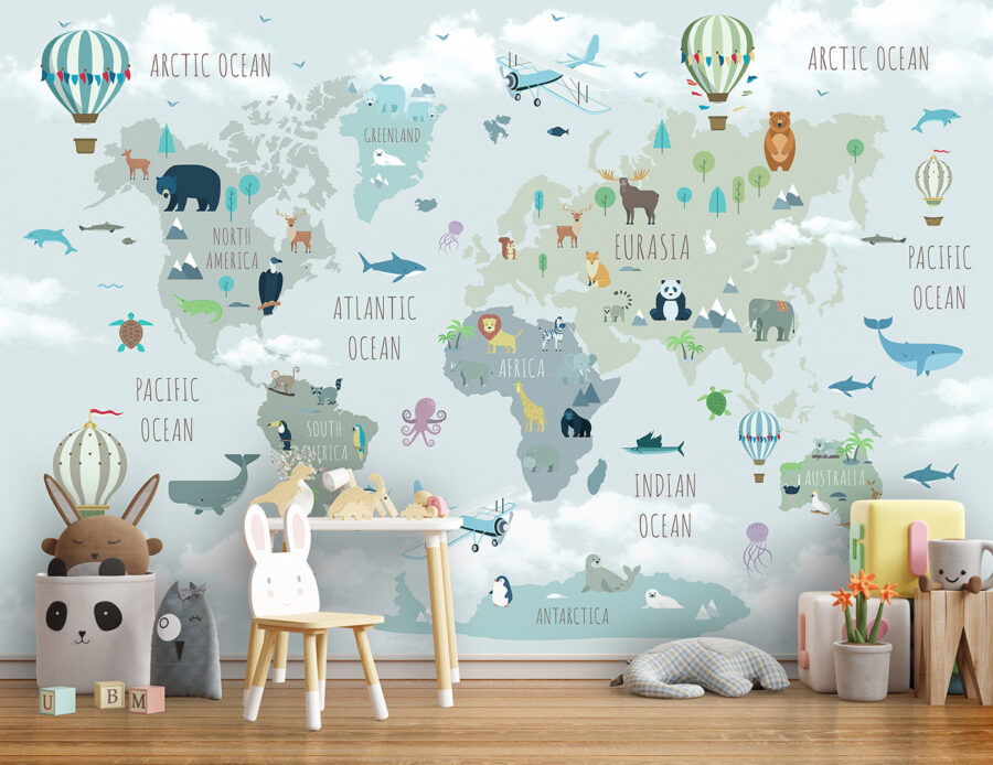 Ooit gedacht om je kleintje mee te nemen op een reis rond de wereld zonder zijn kamer te verlaten? Deze muurschildering “Luchtballon met vlaggen” maakt het mogelijk – en o zo leuk! Het is niet zomaar een kaart; het is een avontuur. Stel je voor dat je door de wolken zweeft in een kleurrijke heteluchtballon, schattige dieren ziet en continenten verkent. Perfect voor nieuwsgierige geesten en dagdromers.