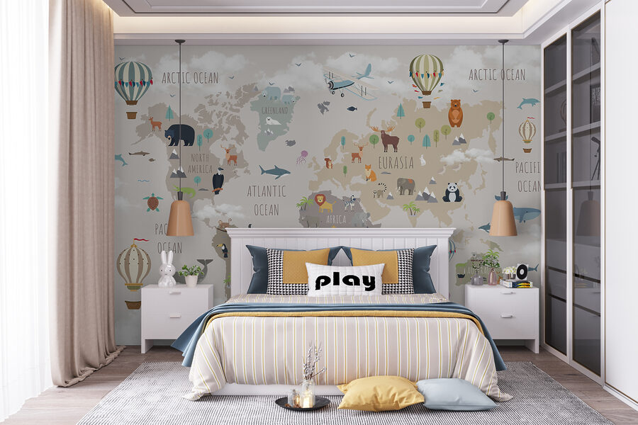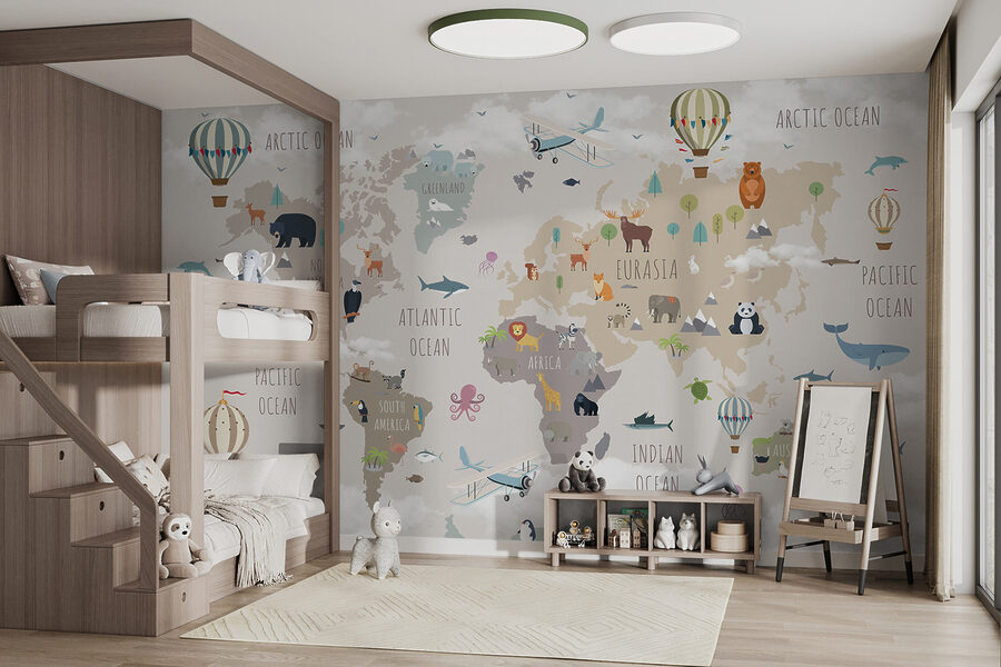 Deze muurschildering is niet alleen decoratie, het is een hele ervaring. Kinderen kunnen over verschillende continenten en oceanen leren terwijl ze hun favoriete dieren zien, van ijsberen in Groenland tot kangoeroes in Australië. De gedempte kleuren zijn rustgevend, perfect voor verhaaltjes voor het slapen gaan of luie zondagmiddagen. Het is het soort decor dat de verbeelding en nieuwsgierigheid prikkelt, waardoor het geweldig is voor kinderkamers, speelzalen of zelfs klaslokalen. Elke dag nieuwe details ontdekken houdt de magie levend.