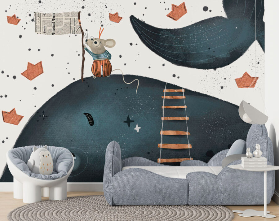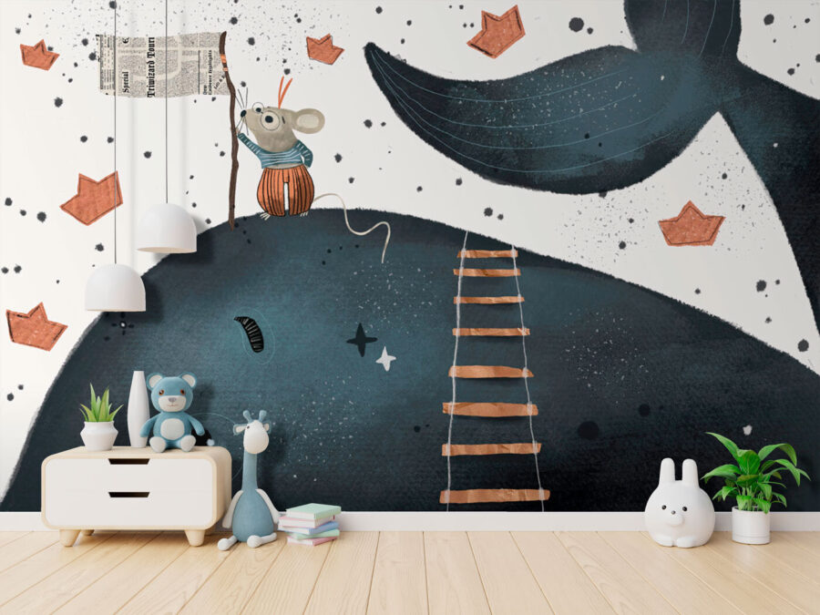 Tover een kinderkamer om in een grillig avontuur met deze prachtige muurschildering. Stel je voor: een vrolijke muis die dapper een ladder beklimt, zwaait met een vlag op een vriendelijke walvis, omringd door charmante papieren bootjes. Het is een visueel verhaal dat er gewoon op wacht om die kleine fantasieën aan te wakkeren.