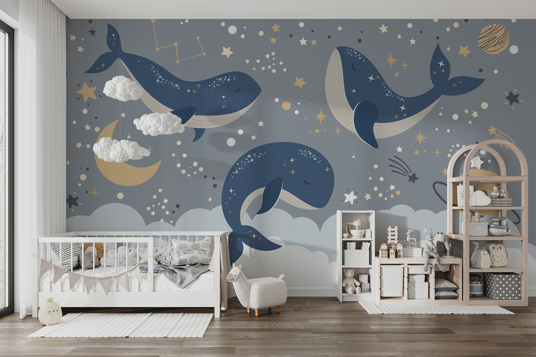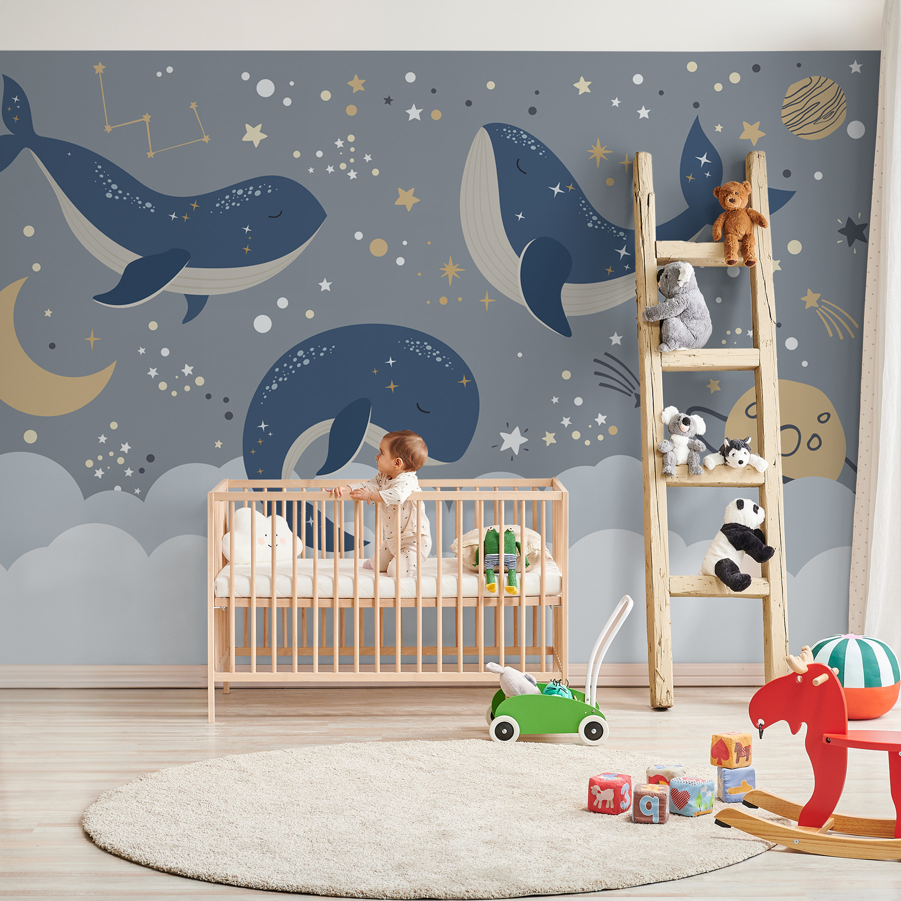 Op zoek naar een wonderlijke muurschildering voor de kamer van je kind? Kijk dan eens naar deze dromerige “Muurschildering Blauwe Walvis met Witte Staart en Sterren!”. Stel je dit eens voor op de muur van je kind – het is net hun eigen stukje van de nachtelijke hemel, compleet met aaibare blauwe walvissen die zachtjes door een zee van sterren en sterrenbeelden zweven. Perfect voor kinderkamers of de ruimte van kleine avonturiers, het voegt precies het juiste vleugje magie en sereniteit toe. Bovendien lijken die slaperige walvissen zoete dromen te beloven voor iedereen die eronder wegdommelt. Het is grillig, rustgevend en een beetje speels – een heerlijke achtergrond voor verhaaltjes voor het slapen gaan en middagdutjes. Of het nu voor je zoon of dochter is, of voor de knuffelmomenten met je baby, het tovert elke muur om in een rustgevend avontuur met sterrenlicht.