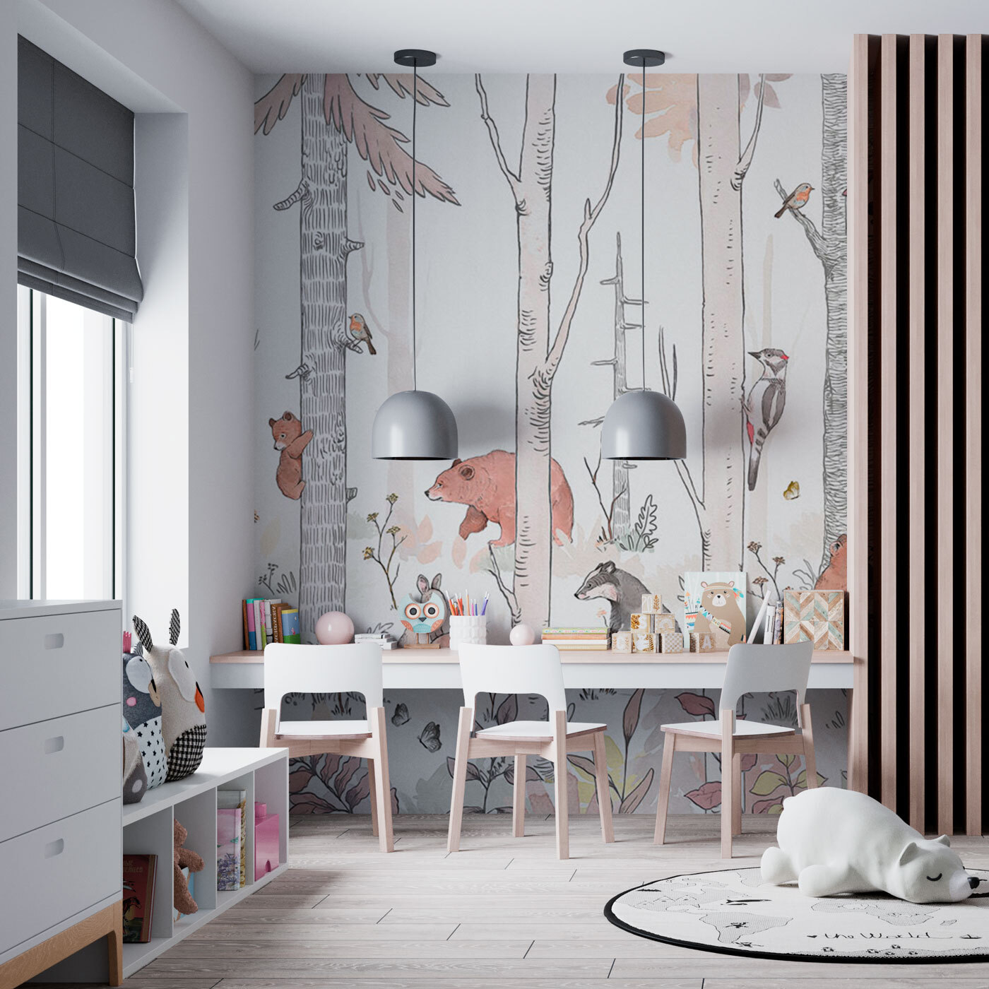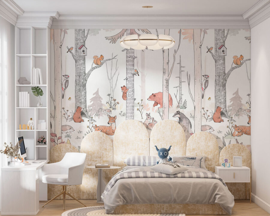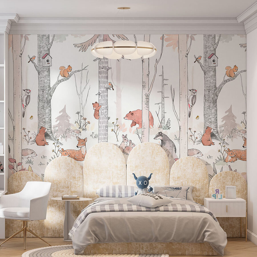 Stel je een gezellig bos voor in je kinderkamer – dat is precies wat deze muurschildering brengt! “Groep dieren in een bos” is alsof je een sprookjesboek openslaat, rechtstreeks op je muur. Het is gevuld met prachtige boswezens: nieuwsgierige eekhoorns, huppelende konijntjes, luie beren en zelfs een attent hertje dat in het oog springt. Door de zachte, aardse kleuren voelt het rustig en magisch aan. Je weet wel, zoals de plek waar je als kind graag op ontdekkingstocht gaat. Kinderen? Die zullen er dol op zijn. En hé, zelfs volwassenen kunnen een beetje rust en eigenzinnigheid vinden in de charme ervan. Stel je verhaaltjes voor het slapengaan voor met deze achtergrond – instant avontuur! Het is niet zomaar een muurschildering, het is een hele nieuwe wereld om in te verdwalen. Perfect voor kinderkamers, speelkamers of waar je maar een vleugje magie van het bos nodig hebt. Creëer herinneringen en verbeeldingskracht – gewoon vanaf je muur!