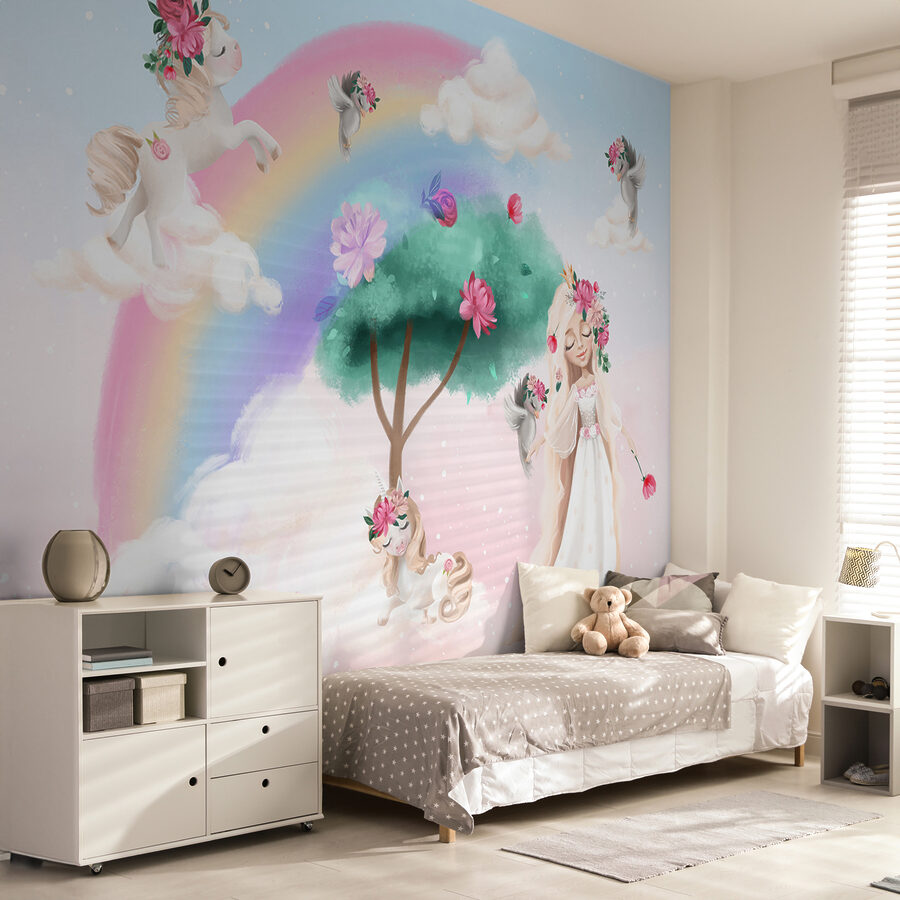 Stel je eens voor: je loopt een kamer binnen waar eenhoorns op pluizige wolken dansen en regenbogen sierlijk over een grillig tafereel buigen. Deze muurschildering “Unicorns and Rainbows in Magical Scene” verandert elke kinderkamer in een dromerig paradijs. De muurschildering is perfect voor kinderkamers, speelkamers of andere eenhoorn-liefhebbers en combineert levendige kleuren en fantasie-elementen om de verbeelding aan te wakkeren. Zie je kleintje al staren naar de charmante eenhoorns en misschien zelfs dromen over hun eigen avonturen. Het is niet zomaar een muurschildering – het is elke dag een magische ervaring! Bovendien is het een leuke manier om verhaaltjes te vertellen of om het slapengaan nog betoverender te maken.