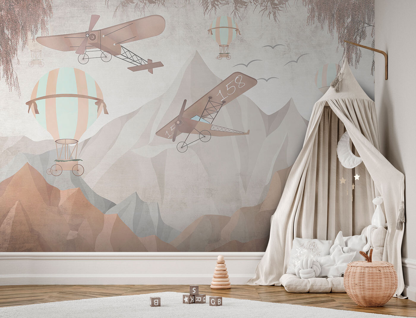 Stel je voor dat je kleintje naar boven staart en zich voorstelt dat hij of zij in zo’n charmante ballon zit. Het is niet zomaar een muurschildering, het is een springplank voor dromerige avonturen en verhalen. Of je kind nu droomt van het besturen van een vintage vliegtuig of van zweven boven de wolken, deze muurschildering stimuleert creativiteit en plezier. Voel je je geïnspireerd? Ja, zo krachtig is het. En wie houdt er niet van een achtergrond die in feite een onmiddellijke ontsnapping naar een serene bergtop is? Helemaal geweldig.