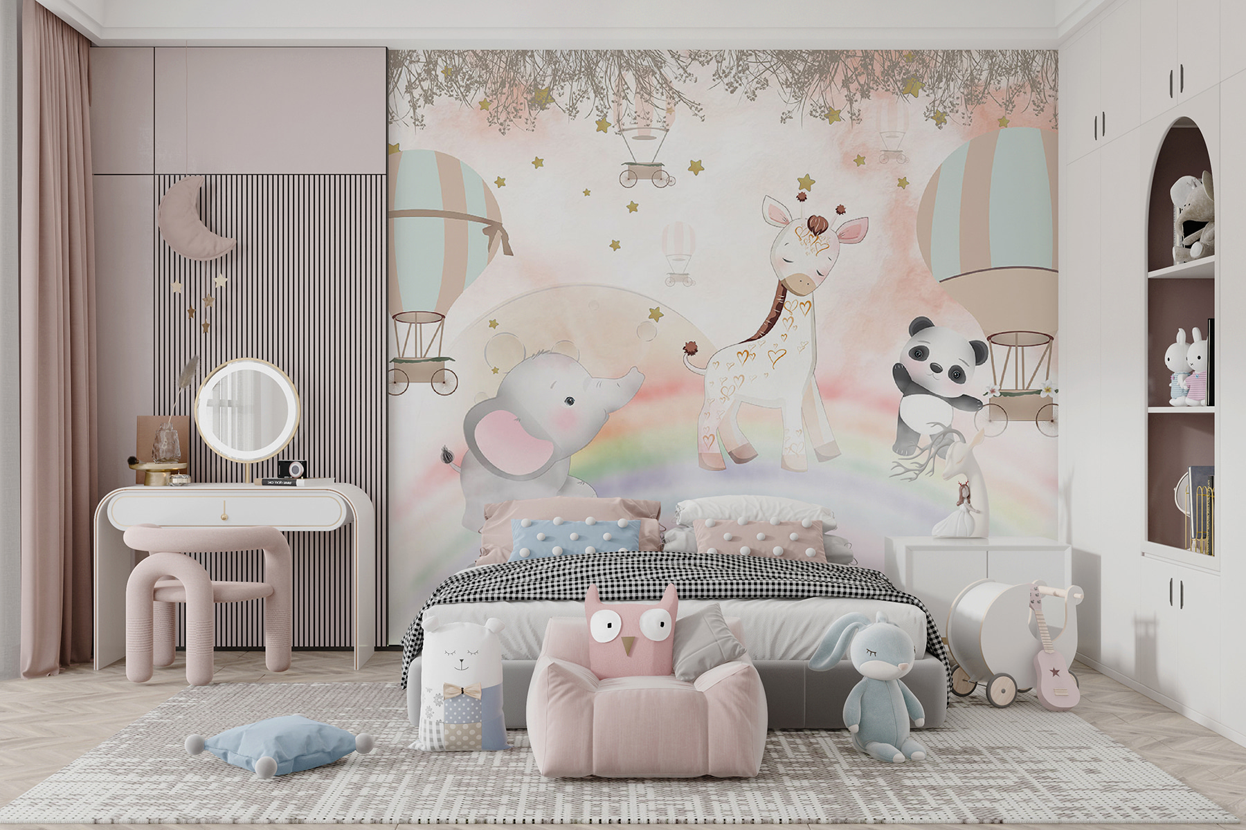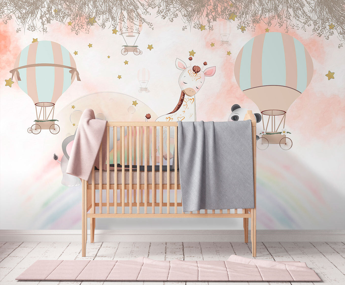 Fleur de kamer van je kind op met deze betoverende muurschildering van heteluchtballonnen! Stel je een dromerige hemel voor met grillige ballonnen die zweven boven schattige dieren zoals een charmante giraffe, een speelse panda en een lief olifantje. Het is een tafereel dat uitnodigt tot avontuur en de verbeelding prikkelt. Stel je voor dat kleintjes ernaar staren, wegdromen naar dromenland en dromen van zweven hoog boven de wolken. De zachte kleuren creëren een gezellige sfeer, perfect voor knuffelige verhaaltjes voor het slapengaan. Deze muurschildering is niet alleen decor; het is een poort naar een fantasiewereld. Wie wil er nou niet mee met die ballonvaarten? Het verandert elke ruimte in een speels toevluchtsoord!