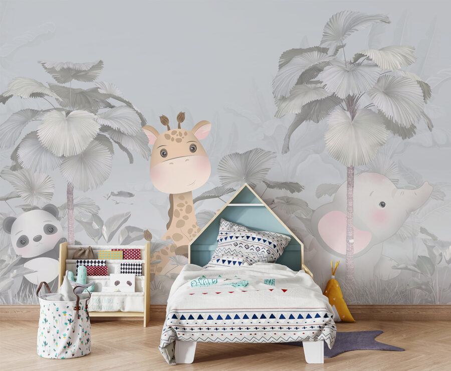 Stel je voor dat je de kamer van je kleintje binnenloopt en begroet wordt door een charmante giraffe en een schattige olifant die rondhangen in een grillig, mistig bos. Deze muurschildering “Fotobehang Giraffe and Elephant in a Forest” is als een sprookjesboek dat tot leven komt. Het is niet alleen een mooi plaatje – het verandert de hele kamer in een dromerige, magische plek. Het heeft iets sprookjesachtigs, met zachte pastelkleuren en die lieve, breedogige dieren die achter de reusachtige bladeren vandaan gluren. Het is perfect om de verbeelding van je kind te prikkelen en een vleugje natuurwonder toe te voegen. Of het nu voor een zoon of dochter is, iedereen zou het gevoel hebben dat ze een gezellige, betoverende jungle binnenstappen elke keer als ze binnenlopen. Stel je voor dat je ze ‘s avonds instopt met deze vriendelijke gezichten die over je waken. Bovendien is het een geweldige gespreksstarter – misschien verzin je wel verhaaltjes voor het slapengaan over deze bosvrienden.