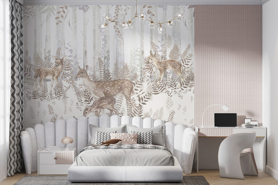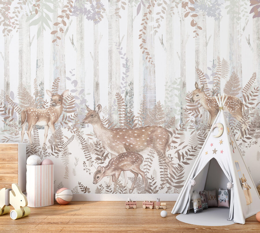 Ooit een muurschildering gezien met dartelende herten in een bos? Deze is gewoon magisch – het is net een scène uit een sprookje! Stel je de kamer van je kleintje voor met deze betoverende print; zachte kleuren en zachte texturen zijn perfect om de verbeelding aan te wakkeren tijdens het spelen of het verhaaltje voor het slapen gaan. Er is iets rustgevends aan die schattige hertjes – ze lijken bijna klaar om van de muur te springen. Of het nu voor de dromerige ruimte van je dochter is of de rustige babykamer, deze muurschildering voegt een grillige, maar toch serene touch toe. Het is meer dan decoratie; het is pure boscharmonie!