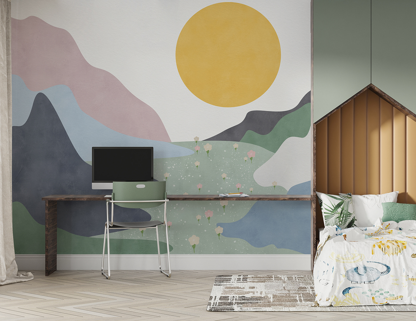 Fleur elke ruimte op met deze speelse muurschildering met een levendige gele cirkel die aanvoelt als een uitbarsting van zonneschijn op een helder wit canvas. Het is het soort ontwerp waardoor je elke keer als je de kamer binnenloopt wilt glimlachen. Perfect voor kinderkamers, het nodigt uit tot verbeelding en verwondering en verandert elke muur in een vrolijke achtergrond voor gegiechel en verhalen. Stel je voor dat kleine voetjes ronddansen, geïnspireerd door al die kleur. Of het nu een kinderkamer, speelkamer of je favoriete leeshoekje is, deze muurschildering biedt een grillig tintje dat creativiteit en plezier stimuleert.