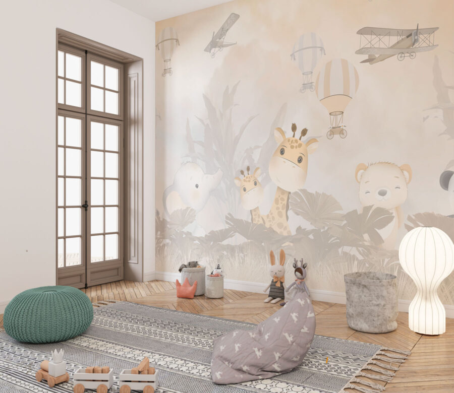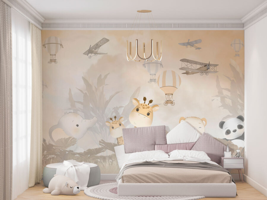 Deze muurschildering is perfect voor zowel zonen als dochters en geeft een gevoel van avontuur en verwondering. De zachte, gedempte tinten maken het een serene toevoeging zonder de kamer te overweldigen. Zie je kind al nieuwsgierig omhoog kijken, misschien verhalen spinnend over hoogvliegende escapades of zachte olifantwandelingen onder een hemel vol ballonnen.