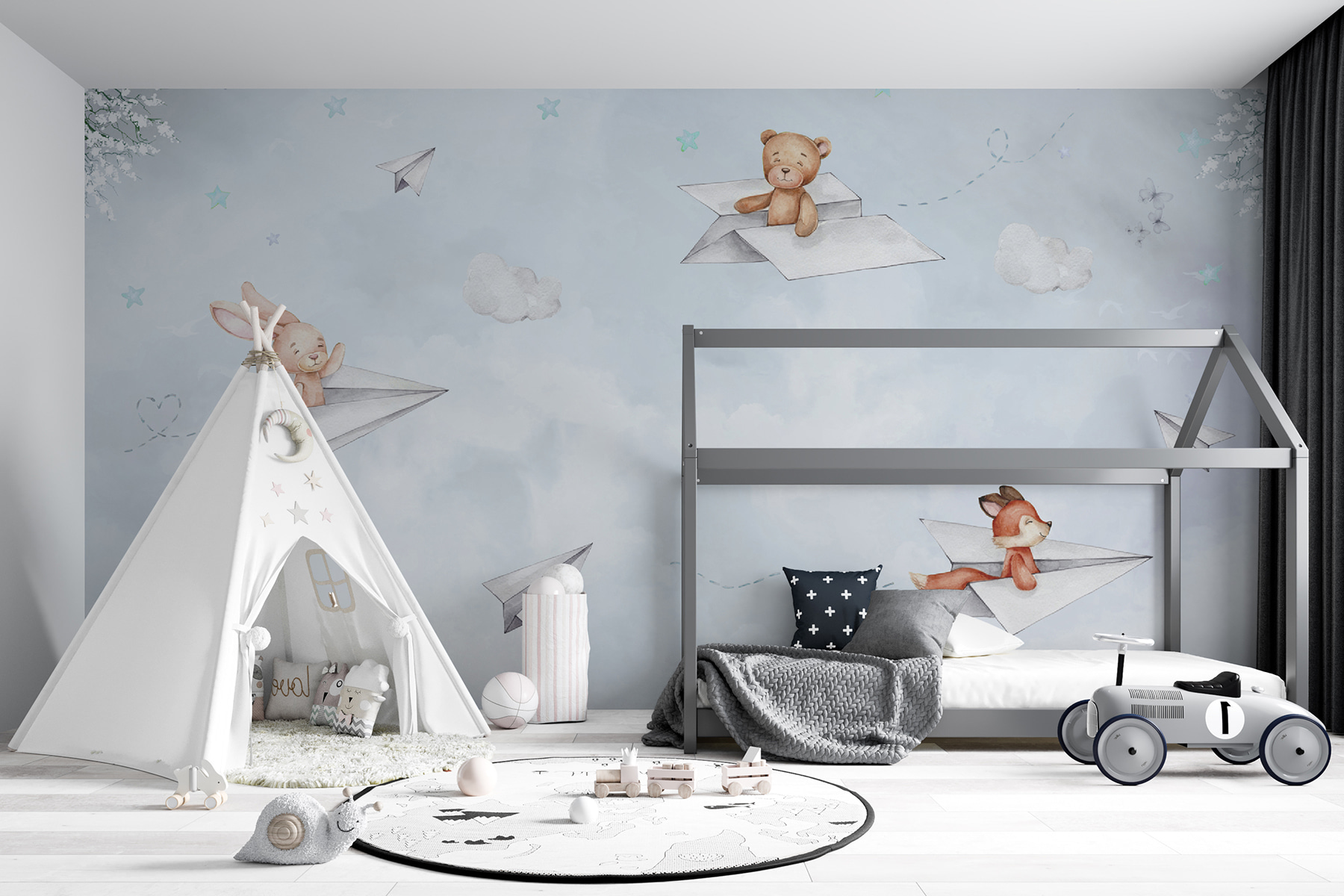 Stel je voor: grillige dieren die door een dromerige hemel zweven, rijdend op papieren vliegtuigjes – hoe heerlijk is dat? De muurschildering “Whimsical Animals Soaring in Sky” brengt de kamer van je kind naar nieuwe hoogten. Schattige beestjes zoals een beer, konijn en vos zweven door wolken en sterren. Het is net een verhaaltje voor het slapengaan dat tot leven komt, perfect om de verbeelding en zoete dromen aan te wakkeren. Of je nu een kinderkamer inricht of een speelkamer een magisch tintje geeft, de zachte kleuren en het charmante ontwerp van deze muurschildering zorgen voor eindeloze glimlachen en een gevoel van verwondering. Een mooie achtergrond voor elke ruimte die bedoeld is om te betoveren en te inspireren. ✨