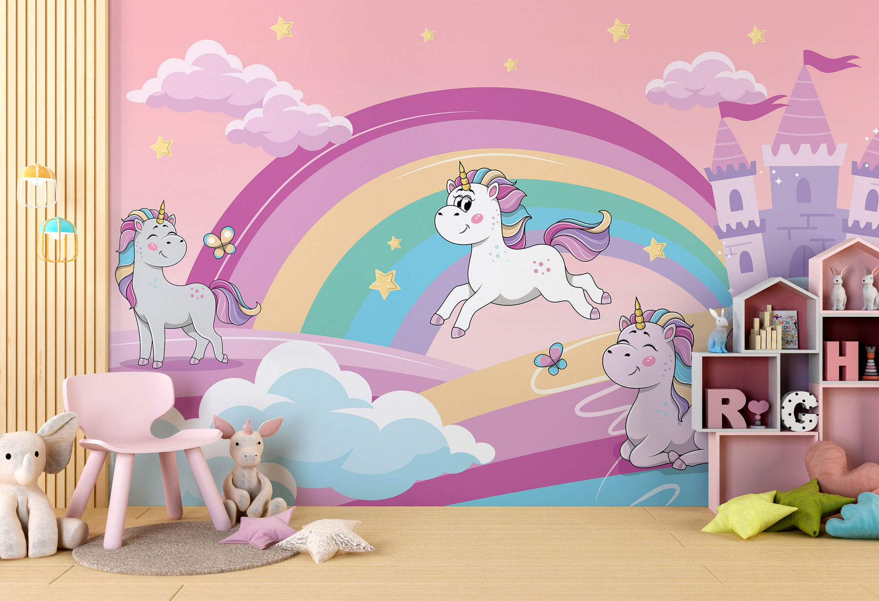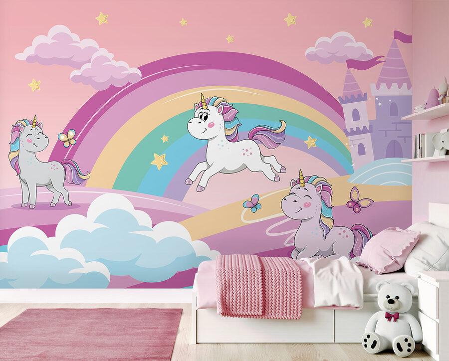 Verander elke gewone kamer in een grillige ontsnapping met deze schattige eenhoorn muurschildering! Stel je vlinders voor die rond kleurrijke regenbogen dansen, terwijl speelse eenhoorns onder een zachtroze hemel dansen. Het is alsof je in een sprookjesboek stapt waar magie slechts een hartslag verwijderd is. Deze muurschildering is perfect om de verbeelding van je kleintje aan te wakkeren en geeft een gezellige, leuke sfeer, waardoor elke dag als een avontuur voelt. Het zorgt zeker voor een glimlach en gegiechel, plus een vleugje vreugde elke keer als ze binnenkomen. Wie wil er nu niet een beetje sprookjesachtige magie op zijn muur?