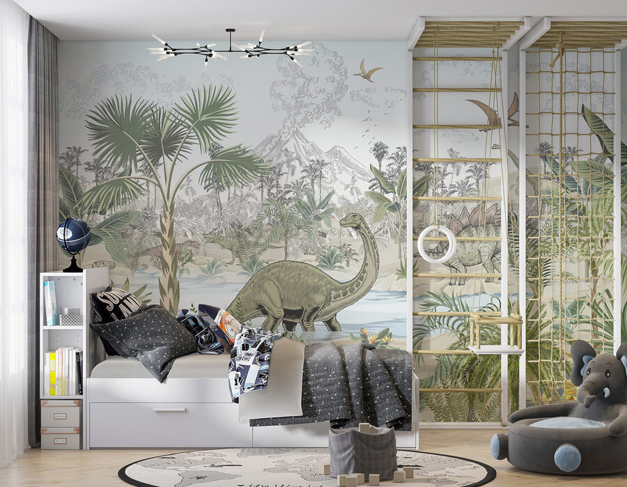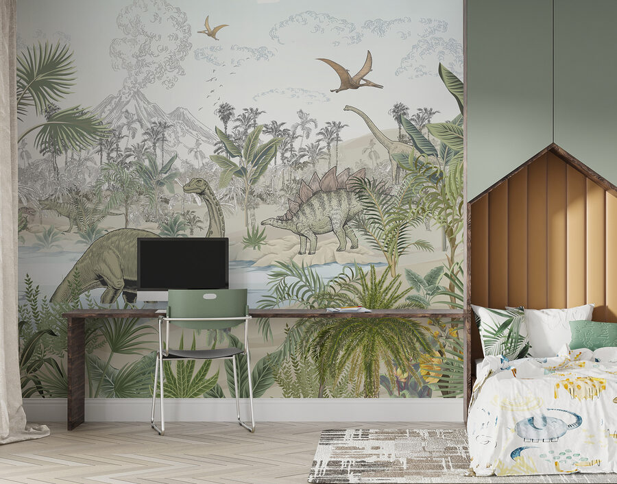 Tover een kinderkamer om in een prehistorisch paradijs met deze levendige muurschildering met majestueuze dinosaurussen die door hun weelderige tropische huis zwerven. Stel je de opwinding voor als kleintjes naar deze vriendelijke reuzen staren, terwijl ze hun fantastische wereld verkennen. Met wuivende palmbomen en een puffende vulkaan op de achtergrond prikkelt deze muurschildering de fantasie en avonturen die verder gaan dan verhaaltjes voor het slapengaan.