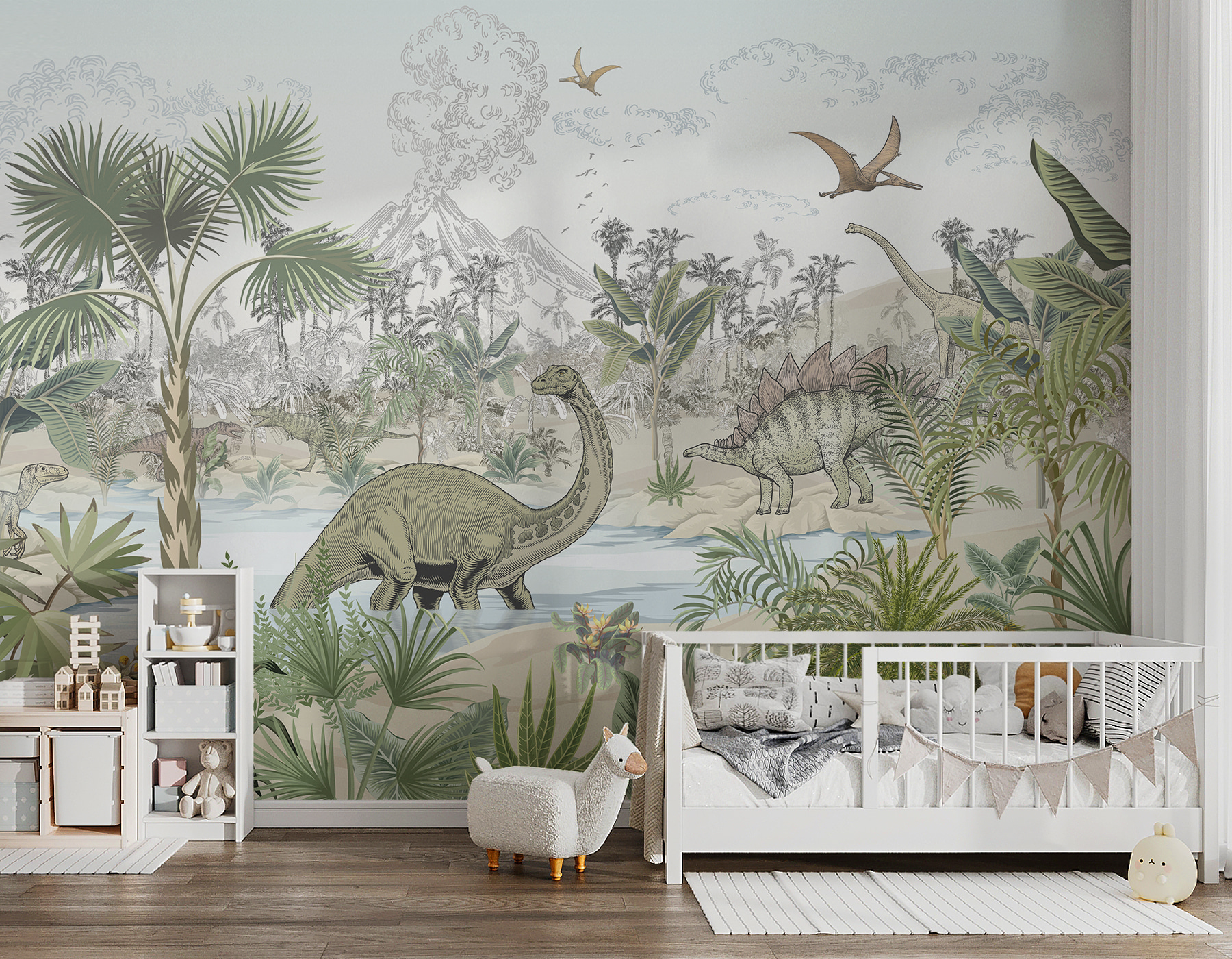 Tover een kinderkamer om in een prehistorisch paradijs met deze levendige muurschildering met majestueuze dinosaurussen die door hun weelderige tropische huis zwerven. Stel je de opwinding voor als kleintjes naar deze vriendelijke reuzen staren, terwijl ze hun fantastische wereld verkennen. Met wuivende palmbomen en een puffende vulkaan op de achtergrond prikkelt deze muurschildering de fantasie en avonturen die verder gaan dan verhaaltjes voor het slapengaan.