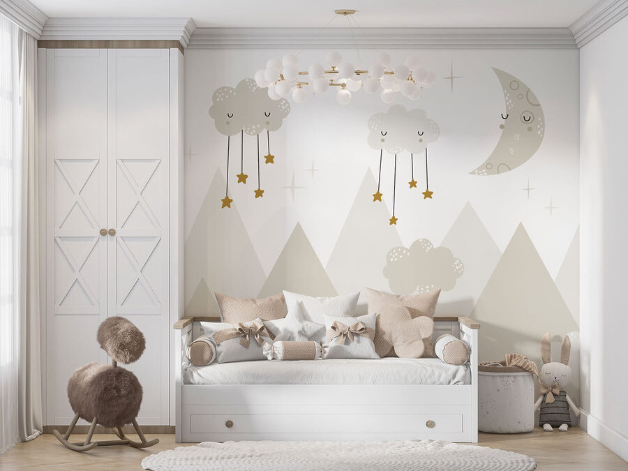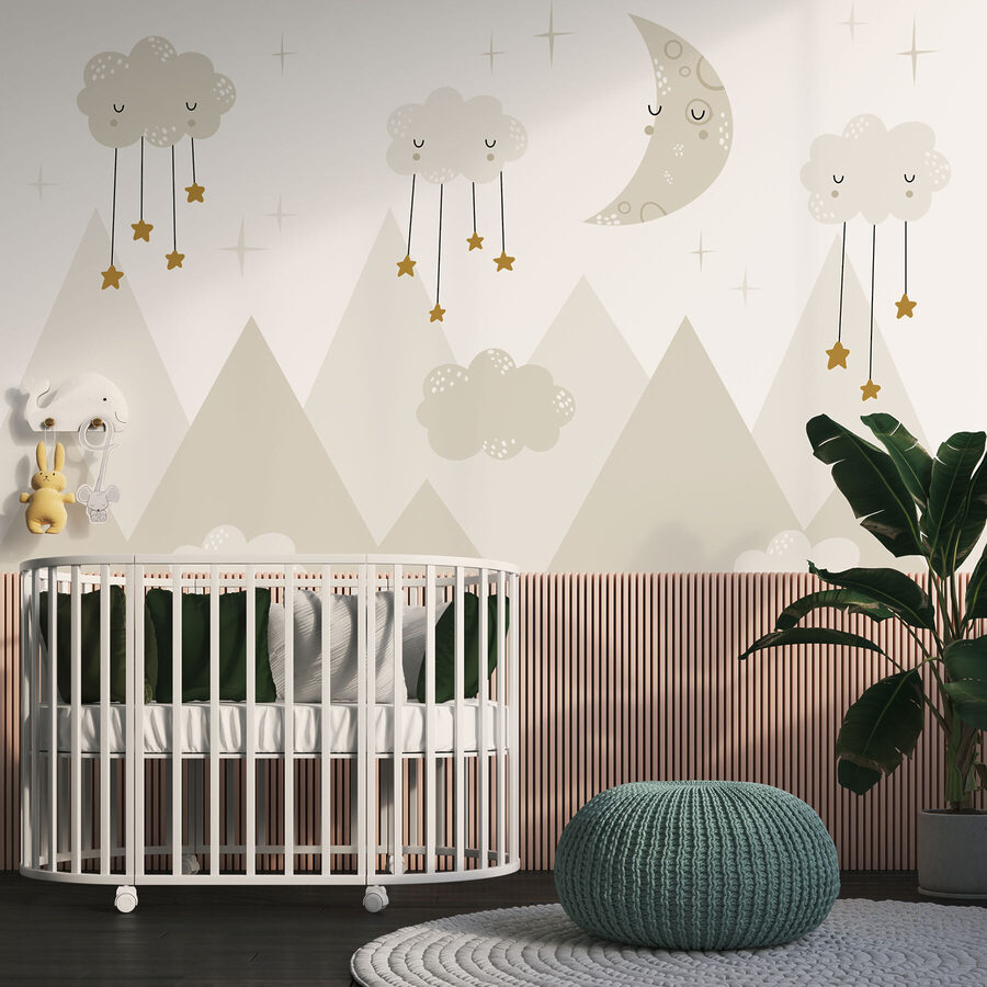 Stel je dit voor: een dromerige nachthemel met een slaperige maan en knusse wolken met sterren, zachtjes gloeiend over bergtoppen. Het is alsof je in een grillig verhaaltje voor het slapengaan stapt! Deze muurschildering is perfect voor de kinderkamer en combineert verbeelding met comfort – het stimuleert de creativiteit van je kleintje en creëert een rustgevende sfeer. Denk aan al die zoete dromen en gegiechel voor het slapengaan. En wie zou er niet graag wegdromen onder zo’n verrukkelijk en rustgevend tafereel? Het is meer dan een decor – het is een klein avontuur, direct aan de muur.