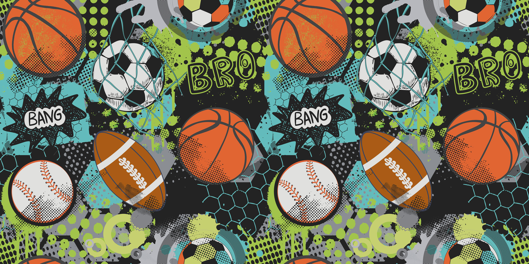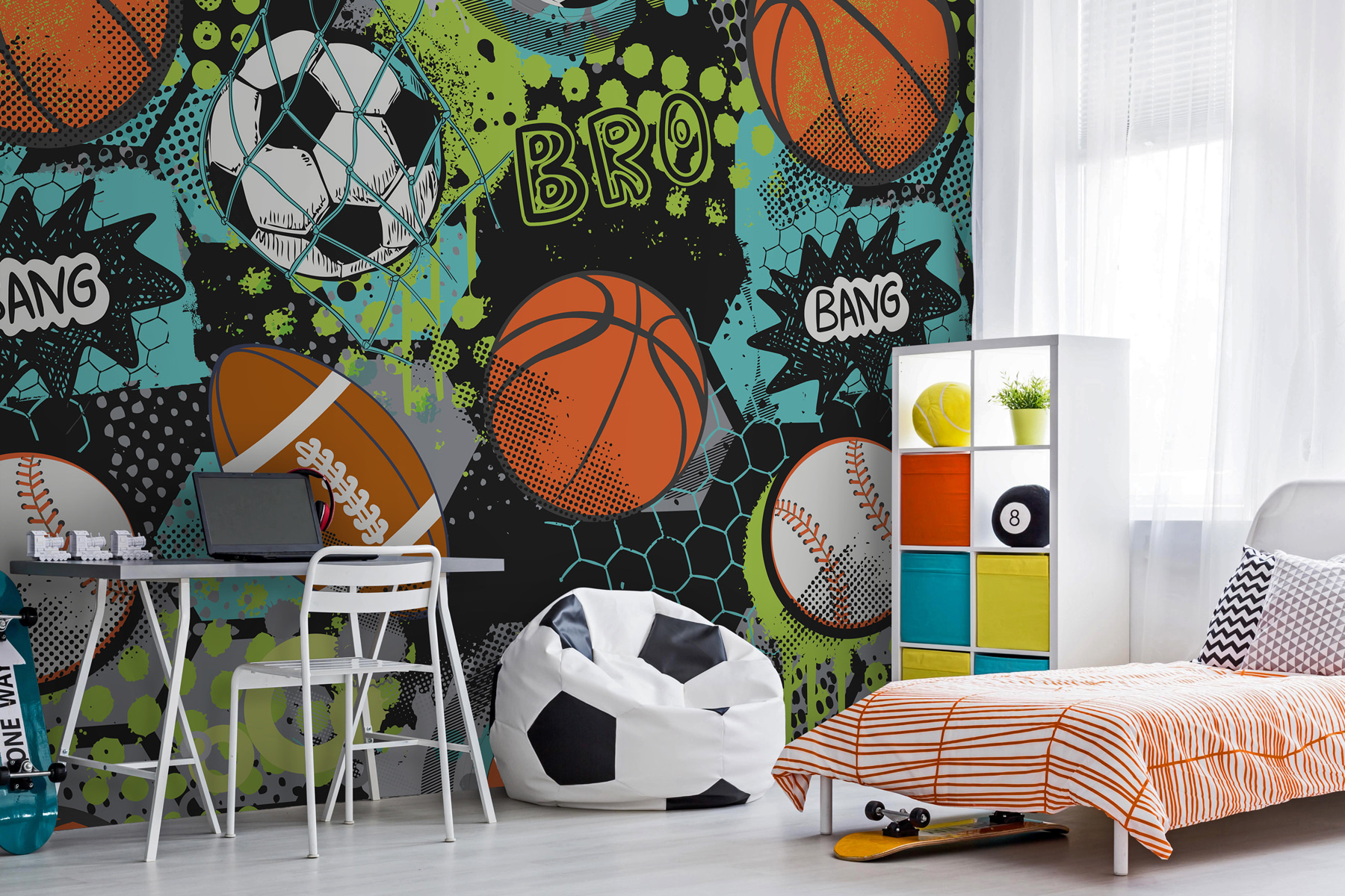 Breng wat levendig plezier in je ruimte met deze “Fotobehang Sport Collage met Levendige Kleuren”. Perfect voor kinderen of tieners, het is net een sportwedstrijd op hun muur – alleen geen zoemende vuvuzela’s, beloofd! Levendig blauw, groen en oranje basketbaltinten spatten over het tafereel, waardoor het lijkt alsof er een wedstrijd in volle gang is. Jonge sportfans zullen enthousiast zijn, en zelfs niet-sportliefhebbers kunnen niet ontkennen hoe cool en energiek dit eruit ziet. Bovendien staan er woorden als “Bang” en “Bro” op – het is net alsof de muur terugpraat! Hang dit op in een slaapkamer, speelkamer of zelfs in de kamer van een jonge vrouw (wie zei dat sport niet geweldig is?) en zie hoe de hele kamer tot leven komt met actie en opwinding. Perfect voor iedereen die een vleugje pit en een vleugje speelsheid in zijn inrichting wil.