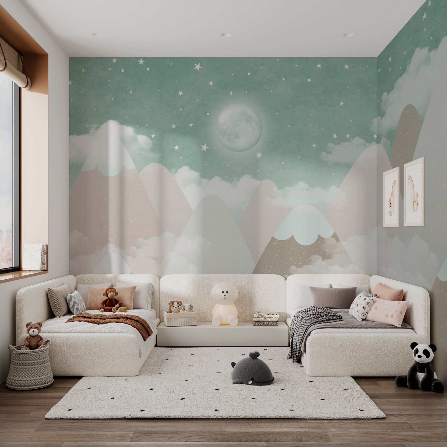 De zachte kleuren en grillige bergvormen zorgen voor een rustgevende sfeer. Je zou jezelf gemakkelijk kunnen verliezen in dit serene tafereel, waar de maan als een zachte beschermer over je sluimering waakt. De sterren, oh, de sterren! Ze fonkelen zachtjes en zorgen voor kleine momenten van verwondering. Stel je voor dat je een verhaaltje gaat vertellen of gaat slapen naast deze charmante achtergrond!