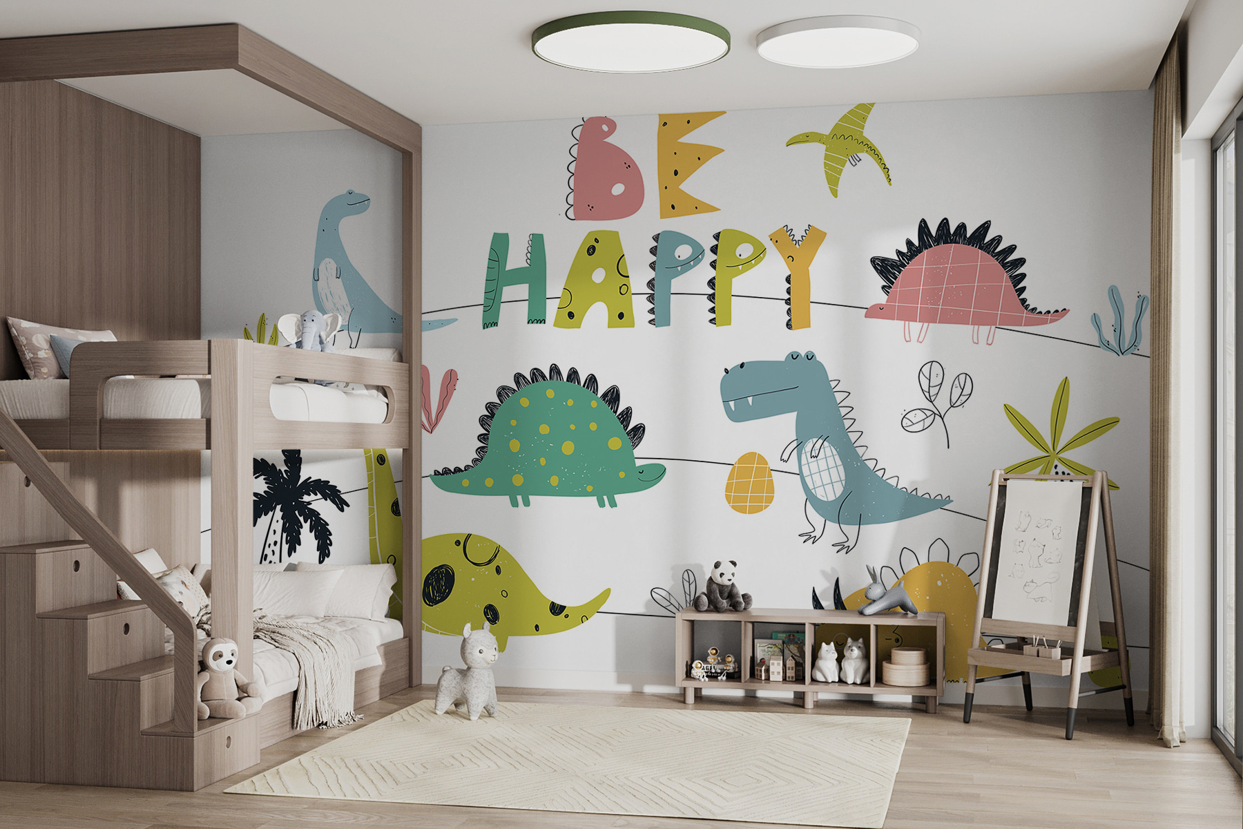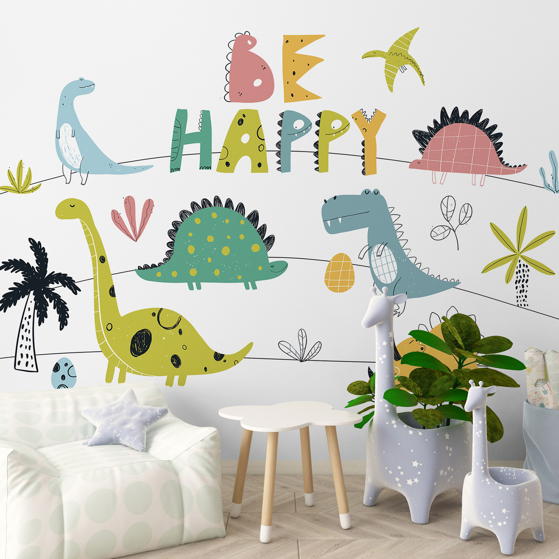 Deze prachtige muurschildering met de grillige titel “Cartoon Dinosaur Holding an Egg” is een must voor mensen die een vrolijke noot willen toevoegen aan een kinderkamer of speelse ruimte. Stel je een kudde vrolijke dino’s voor, allemaal uitgedost in pasteltinten, waarbij één beestje trots een ei vasthoudt. Het is net alsof je in een zaterdagochtend tekenfilm stapt! Kinderen zullen dol zijn op het levendige tafereel vol vriendelijke dinosaurussen en de hartverwarmende boodschap “Be Happy”. Het is leuk, levendig en brengt een beetje prehistorische vrolijkheid in je favoriete kamer. Perfect om jonge verbeelding aan te wakkeren of om een ruimte extra gezellig en grillig te maken.