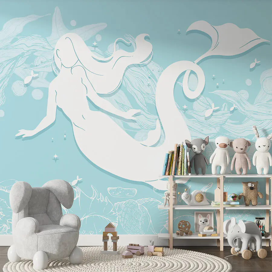 Stel je voor dat je de kamer van je kleintje omtovert in een dromerig onderzees avontuur met deze betoverende “Muurschildering w01316”. Perfect voor elk meisje dat droomt van oceanen en zeemeerminnen, voegt deze muurschildering een grillig tintje toe aan haar kamer. Met zachte oceaanblauwtinten en een sierlijk silhouet van een zeemeermin voelt het alsof ze in een sprookje stapt telkens als ze de kamer binnenkomt. Het is niet alleen decor – het is een verhaal dat wacht om beleefd te worden. Stel je een verhaaltje voor onder de golven… Glimlachen gegarandeerd! Leuk voor dochters, maar past ook bij elke jonge vrouw met een speels hart en gevoel voor avontuur. Duik in de magie en laat je verbeelding de vrije loop!