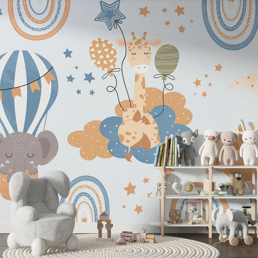 Tover de kamer van je kleintje om in een grillig wonderland met deze betoverende muurschildering! Stel je speelse dieren voor zoals een dromerige giraffe en een slaperige olifant die tussen de wolken en ballonnen zweven en een vleugje magie in het dagelijkse leven brengen. Het is alsof een sprookjesboek tot leven komt op je muren. Stel je avonturen voor het slapengaan voor onder de waakzame blik van deze charmante dieren! De zachte kleuren kalmeren, terwijl de prachtige ontwerpen de verbeelding aanwakkeren. Deze muurschildering is perfect voor kinderkamers of speelzalen en zal zeker inspireren tot gegiechel, knusse knuffels en zoete dromen. Wie wil er nu geen leuke muurschildering boven zijn bed?