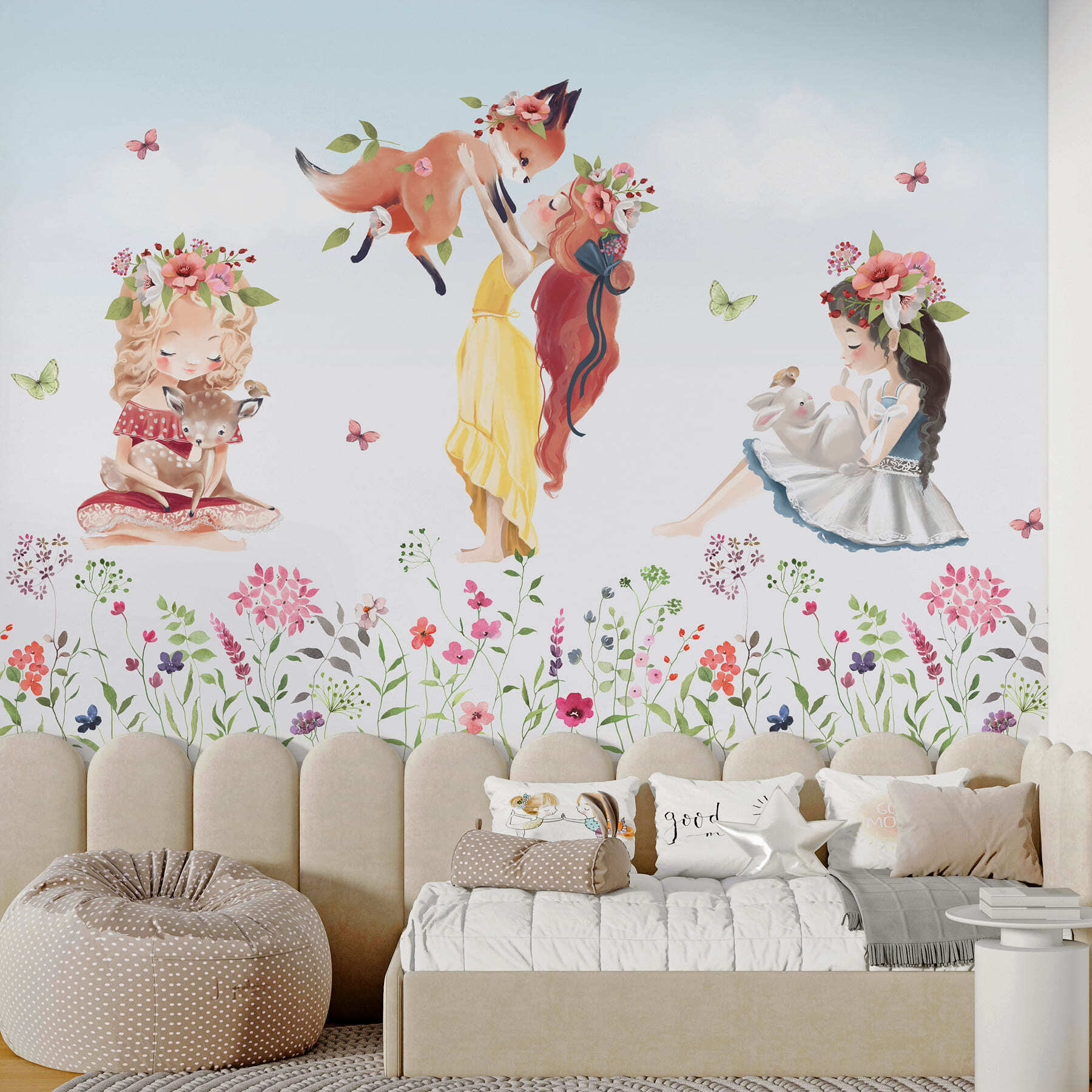 Transformeer elke ruimte met deze betoverende muurschildering met een charmante groep meisjes en schattige dieren te midden van een levendig bloemenveld. Stel je de verrukkelijke lach en gilletjes van vreugde voor, waardoor het een perfecte achtergrond is voor speelse momenten. Elk meisje, met haar unieke stijl en knuffelige metgezel, vangt een grillige geest die voelt alsof je een sprookjesboek binnenstapt. Het is niet alleen decor; het nodigt uit tot verbeelding en verwondering. Door een vleugje magie toe te voegen, maakt deze muurschildering een mooi statement in kinderkamers of speelruimtes en creëert een uitnodigende oase vol kleur en warmte. Het is een stralende herinnering aan zorgeloze dagen in de buitenlucht en zal zeker hartverwarmende gesprekken en mooie herinneringen oproepen.