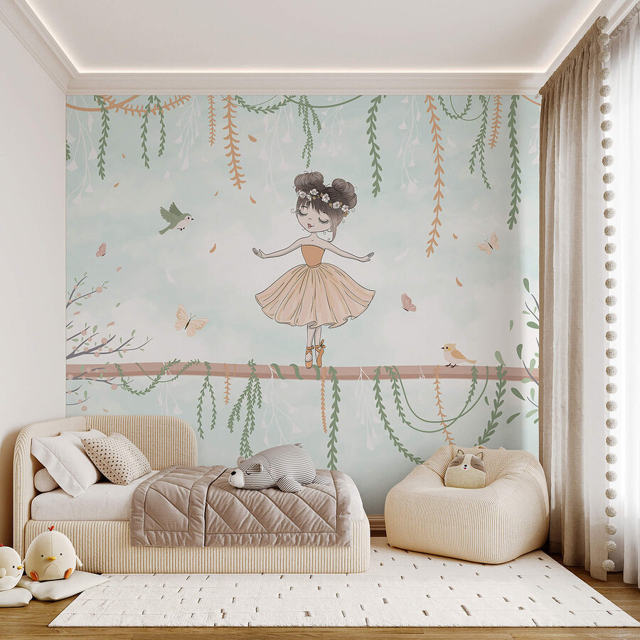 Stel je een sprookjesachtige ontsnapping voor, rechtstreeks op je muren! Deze charmante muurschildering toont een vrolijk meisje dat op een tak danst, omringd door fladderende vlinders en nieuwsgierige vogels. De zachte pastelkleurige achtergrond zorgt voor een serene sfeer, waardoor elke kamer aanvoelt als een dromerig toevluchtsoord in het bos. Het is perfect om de fantasie van kinderen te prikkelen of gewoon om een vleugje magie toe te voegen aan een kinderkamer of speelkamer. Stel je voor hoe het voorlezen van verhaaltjes verandert in een avontuur terwijl kinderen naar dit betoverende tafereel staren, volledig in de ban van de lieflijkheid ervan. Echt, wie zou er niet vrolijk met haar mee willen dansen? Een vleugje vreugde voor muren die om een glimlach vragen!