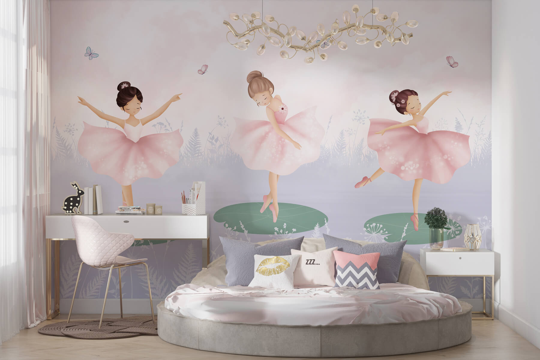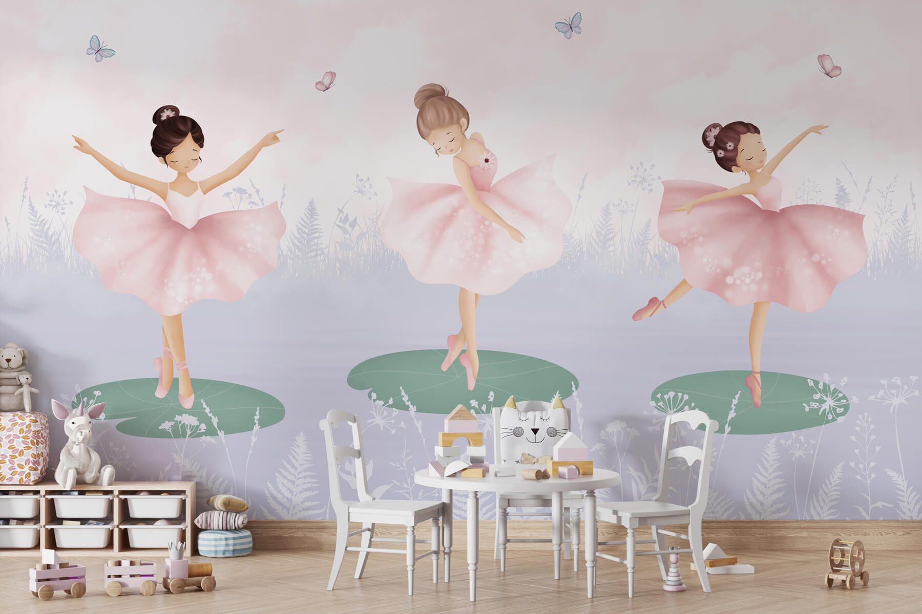 Tover een kinderkamer om in een dromerig wonderland met deze prachtige muurschildering van een trio meisjes in tutu-rokjes die dansen op lelieblad. Stel je de vreugde op kleine gezichtjes voor als ze een ruimte betreden waar sprookjes tot leven komen. Elke danseres draait sierlijk rond, omringd door grillige vlinders en zachte pasteltinten die een rustige toon zetten. Het is alsof je in een sereen ballet stapt, waar elke blik creativiteit en gegiechel opwekt. Deze muurschildering is niet alleen decor; het is een portaal naar de verbeelding, perfect om verhalen over magische avonturen op te wekken in de stille tijd of voor het slapengaan. Hij fleurt moeiteloos elke muur op en brengt charme en vrolijkheid die de kamer vullen met warmte en eigenzinnigheid.