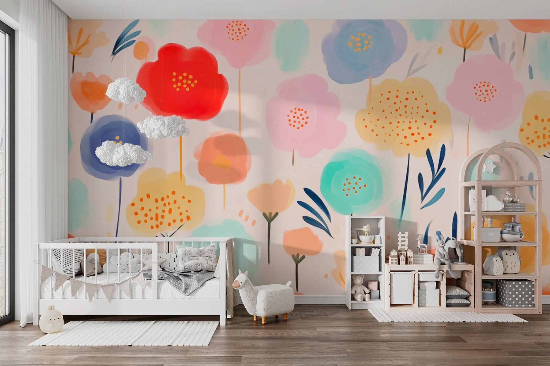 Verander een saaie muur in een bloeiend paradijs met deze levendige muurschildering met kleurrijke bloemen op een zacht witte achtergrond. Stel je voor dat je een levendige tuin binnenstapt telkens als je de kamer binnenkomt, omringd door vrolijke bloemen. Het is alsof je het plezier van de lente binnenshuis brengt – water geven is niet nodig! Perfect voor de ruimte van een kleintje of zelfs een speels accent in een gezellige leeshoek. Elk bloemblaadje lijkt te fluisteren: “Laten we plezier maken! Het grillige ontwerp van deze muurschildering voegt een vleugje persoonlijkheid toe, waardoor elke ruimte direct helderder en uitnodigender aanvoelt. Bovendien is het een moeiteloze manier om de verbeelding en creativiteit aan te wakkeren. Wie wil er nu niet dagdromen tussen deze prachtige bloemen?