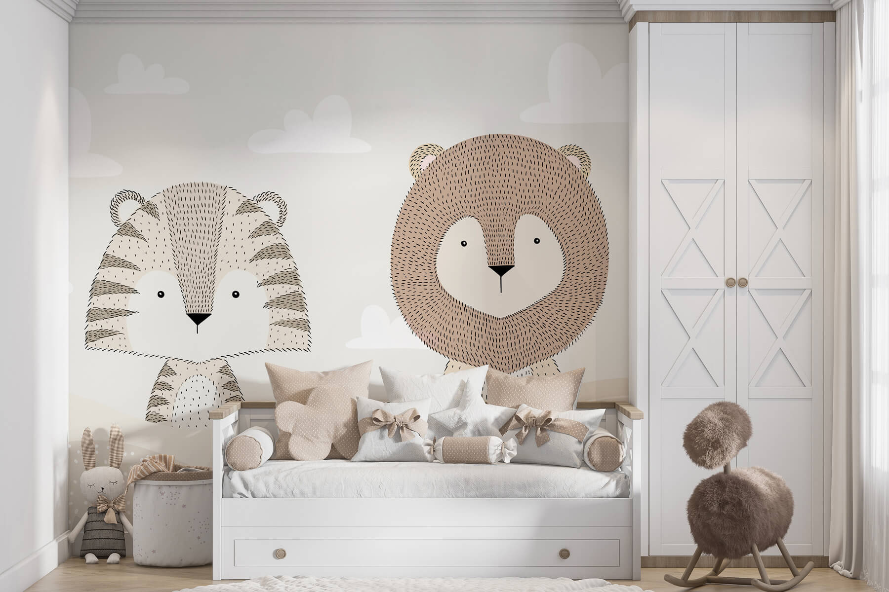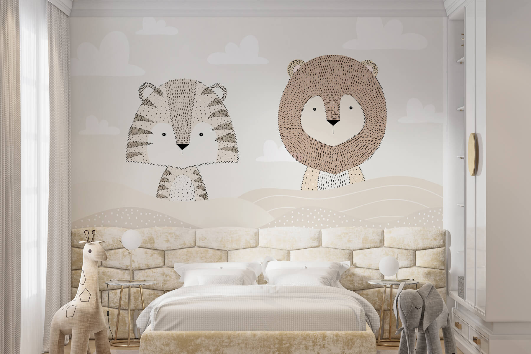 Breng een vleugje avontuur in de wereld van je kleintje met deze prachtige muurschildering met een leeuw en een tijger die luieren in een sereen woestijnlandschap. Het is net een tropische vakantie aan je muur! De zachte kleuren creëren een rustige sfeer, perfect om overdag in weg te dromen of om ‘s nachts in weg te kruipen. Stel je voor dat je voor het slapen gaan verhaaltjes vertelt over jungle-escapades onder deze charmante beestjes – kleintjes zullen wegdromen met gedachten aan speelse avonturen. Deze muurschildering is een held en een vriend en geeft elke kamer een magisch gevoel. Perfect voor kinderkamers of babykamers, het voegt zowel plezier als warmte toe. Bovendien, wie houdt er niet van een paar schattige dierenvriendjes?