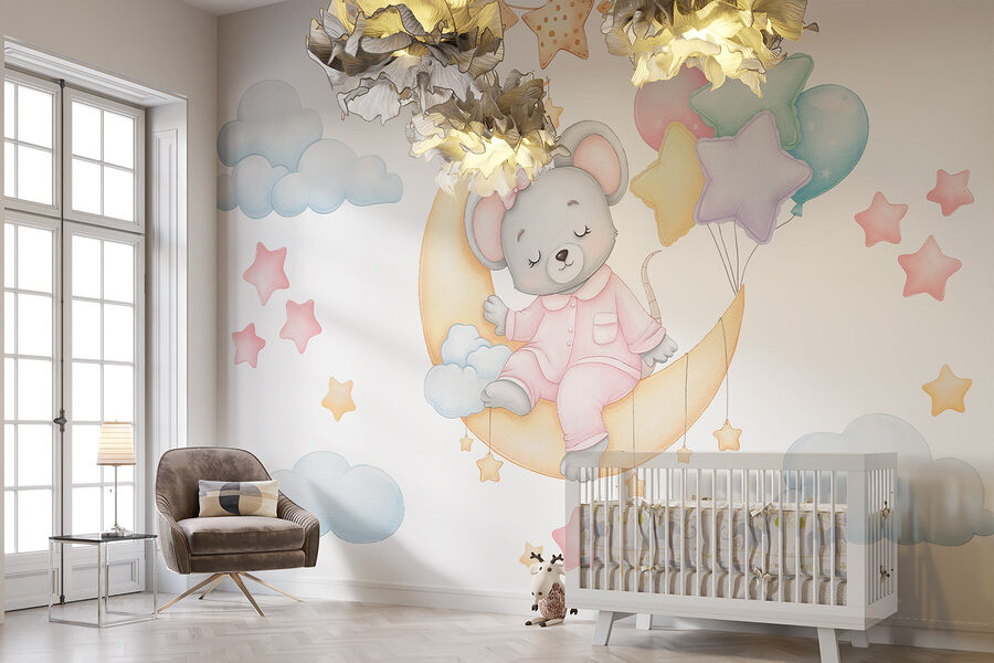 Tover elke kamer om in een dromerige ontsnapping met deze betoverende muurschildering met een muis die lekker op de maan ligt en kleurrijke ballonnen vasthoudt. Stel je een zachte gloed voor die de kleine sterren verlicht, terwijl je kleintje in slaap valt en droomt van grillige avonturen tussen de wolken. Het is net een verhaaltje voor het slapengaan dat tot leven komt – perfect voor kinderkamers of speelzalen! Het pastelkleurige palet creëert een rustgevende sfeer, waardoor het gemakkelijk is om je al het gegiechel en de zoete dromen voor te stellen die dit charmante tafereel zou kunnen inspireren. Voeg een vleugje magie toe aan de muren en laat de verbeelding de vrije loop!