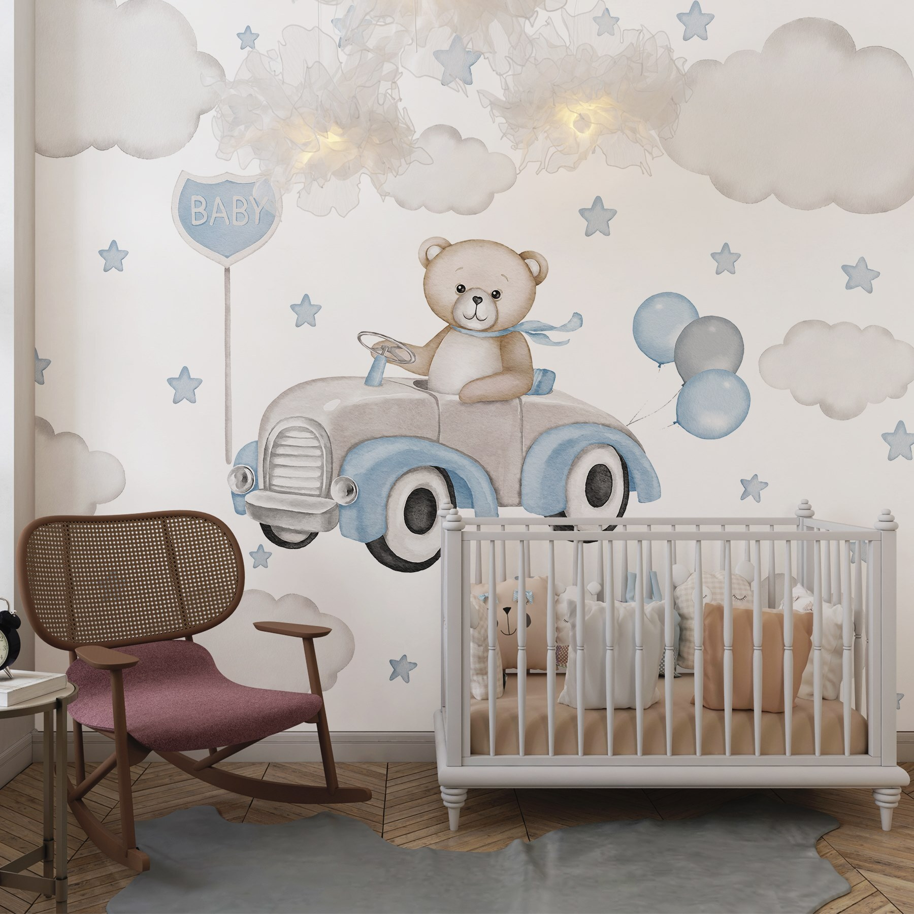 Verander de ruimte van een kind in een avontuur met deze charmante muurschildering met een teddybeer die in een schattige auto zoeft en kleurrijke ballonnen vasthoudt. Het is net een sprookjesboekscène op de muur! Stel je de verrukking voor op het gezicht van je kleintje telkens als ze de kamer binnenkomen. De speelse kleuren en het grillige ontwerp zorgen voor de perfecte stemming om groots te dromen. Bovendien voegen die pluizige wolken en fonkelende sterren een vleugje magie toe. Het is niet alleen decor; het is een uitnodiging tot vrolijke dagdromen en grenzeloze verbeelding. Wie zou er niet in die auto willen springen voor een ritje?