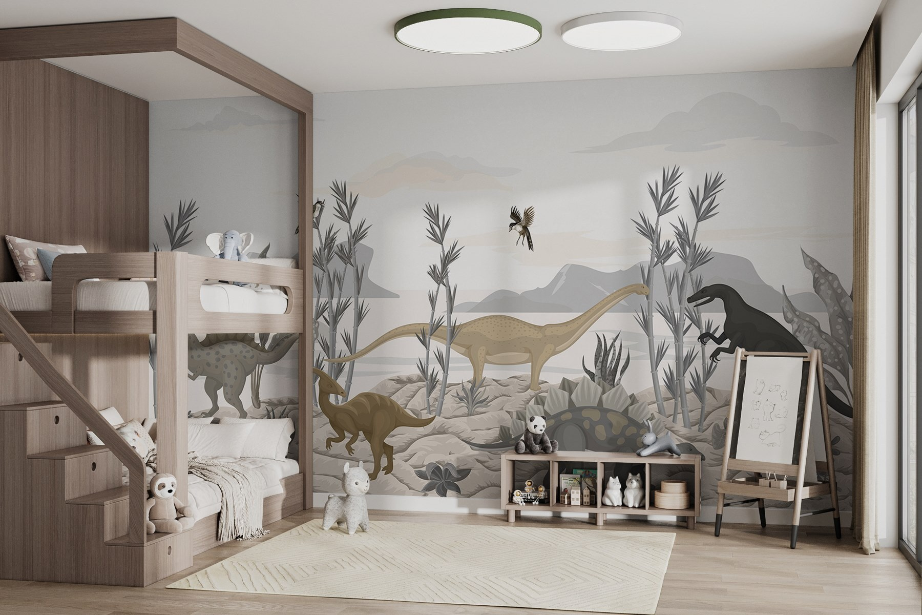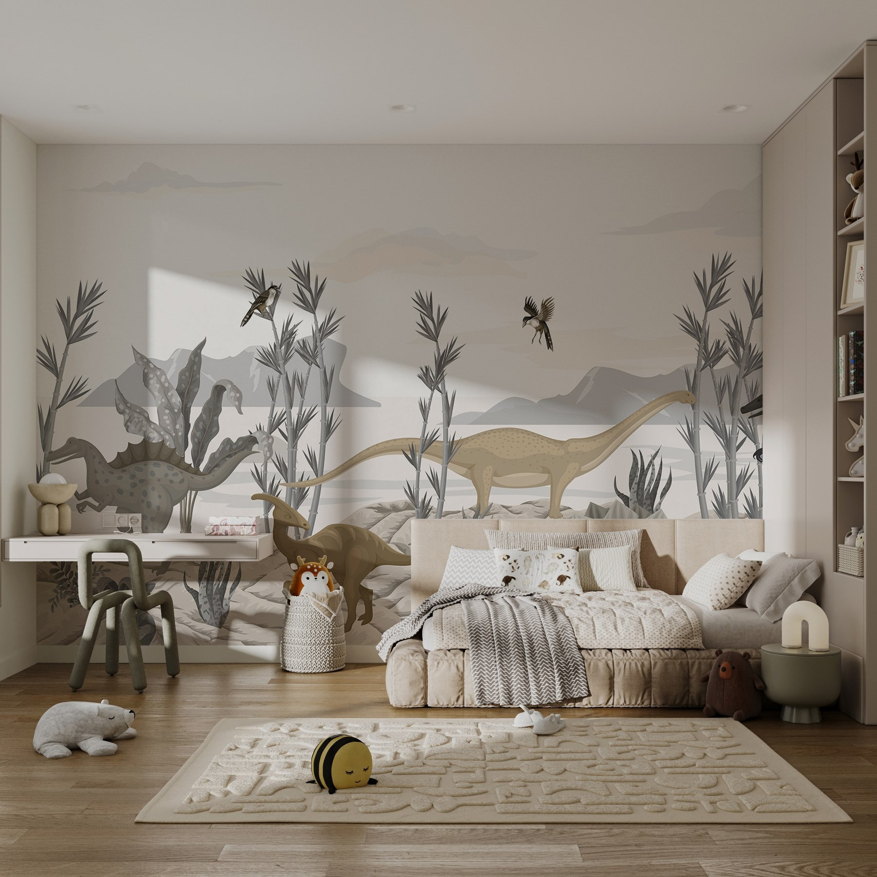 Tover elke kamer om in een prehistorisch paradijs met deze grillige muurschildering van dartelende dinosaurussen in een zonovergoten woestijn. Stel je kleine ontdekkingsreizigers voor die met grote ogen naar deze vriendelijke reuzen staren en zich misschien zelfs proberen voor te stellen wat ze zouden doen als ze er een tegenkwamen! De zachte, aardse tinten creëren een rustgevende sfeer, waardoor het perfect is voor een kinderkamer of speelkamer. En laten we eerlijk zijn: wie wil niet het gevoel hebben dat hij in een dino wonderland is gestapt? Of het nu verhalen of speelse avonturen inspireert, deze muurschildering brengt een gevoel van vreugde en verbeelding in elke ruimte. Kijk alleen uit voor de kleine T. rex: hij kan je besluipen!