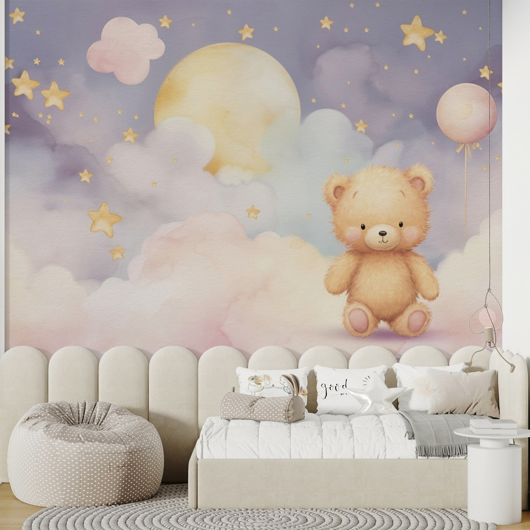 Transformeer een kinderkamer met deze betoverende muurschildering met een schattige teddybeer die chillt op een pluizige wolk. Stel je voor dat je hun kamer decoreert met een stuk dat aanzet tot giechelen en dagdromen. De pastelkleuren dansen als zacht gefluister, waardoor het knus en grillig aanvoelt. Het is alsof je een stukje hemel in huis haalt, perfect voor de momenten waarop verhaaltjes voor het slapen gaan een vlucht nemen. Zie de verrukking op het gezicht van je kleintje als ze de fonkelende sterren en de zachte ballon voorbij zien zweven. Dit is niet zomaar decoratie; het is een poort naar een wereld vol verbeelding en zoete dromen. Deze muurschildering is perfect voor kinderkamers of speelzalen en voegt warmte en een vleugje magie toe, waardoor elke blik een reden is om te glimlachen.