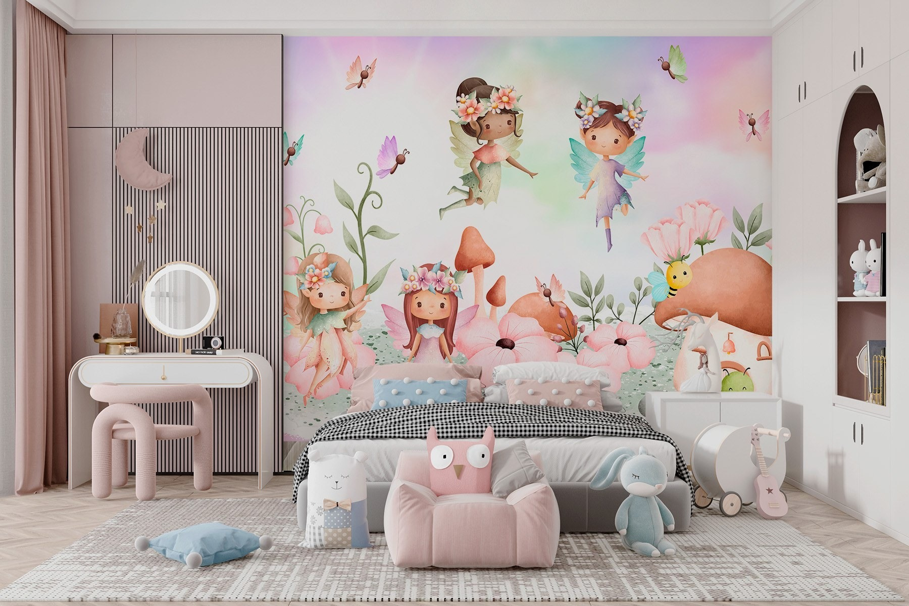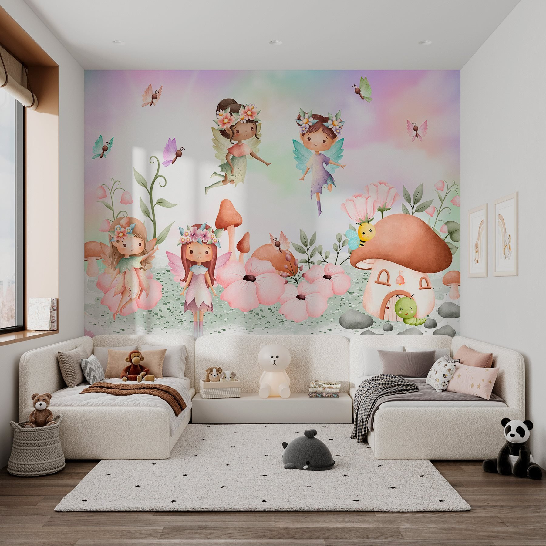 Tover elke kamer om in een grillig wonderland met deze charmante muurschildering met een prachtige groep feeën die ronddartelen in een levendige tuin. Stel je voor: kleintjes die vol ontzag naar vliegende elfjes en bloeiende bloemen staren. Het is de perfecte magische vonk voor de kinderkamer, die hun verbeelding prikkelt zoals de eerste vlinderfladder. Misschien creëren ze zelfs hun eigen sprookjes in de kamer! En wie houdt er niet van een klein bijtje dat rond een paddenstoelenhuisje zoemt? Het is alsof je elke dag in een sprookjesboek stapt. Er staat je een waar avontuur te wachten!